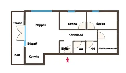 A lakás elrendezése: tágas, amerikai konyhás nappali étkezővel (34 nm), 2 hálószoba (13 nm + 12 nm), modern fürdőszoba káddal és WC-vel, külön WC. A konyha teljesen gépesített (beépített mosogatógép, hűtő, sütő), a lakás részben bútorozva eladó (étkezőasztal, székek, kanapé, szekrény). Minden szobában redőny található (távirányítós), a mennyezeti hűtés-fűtést pedig egy klíma egészíti ki.