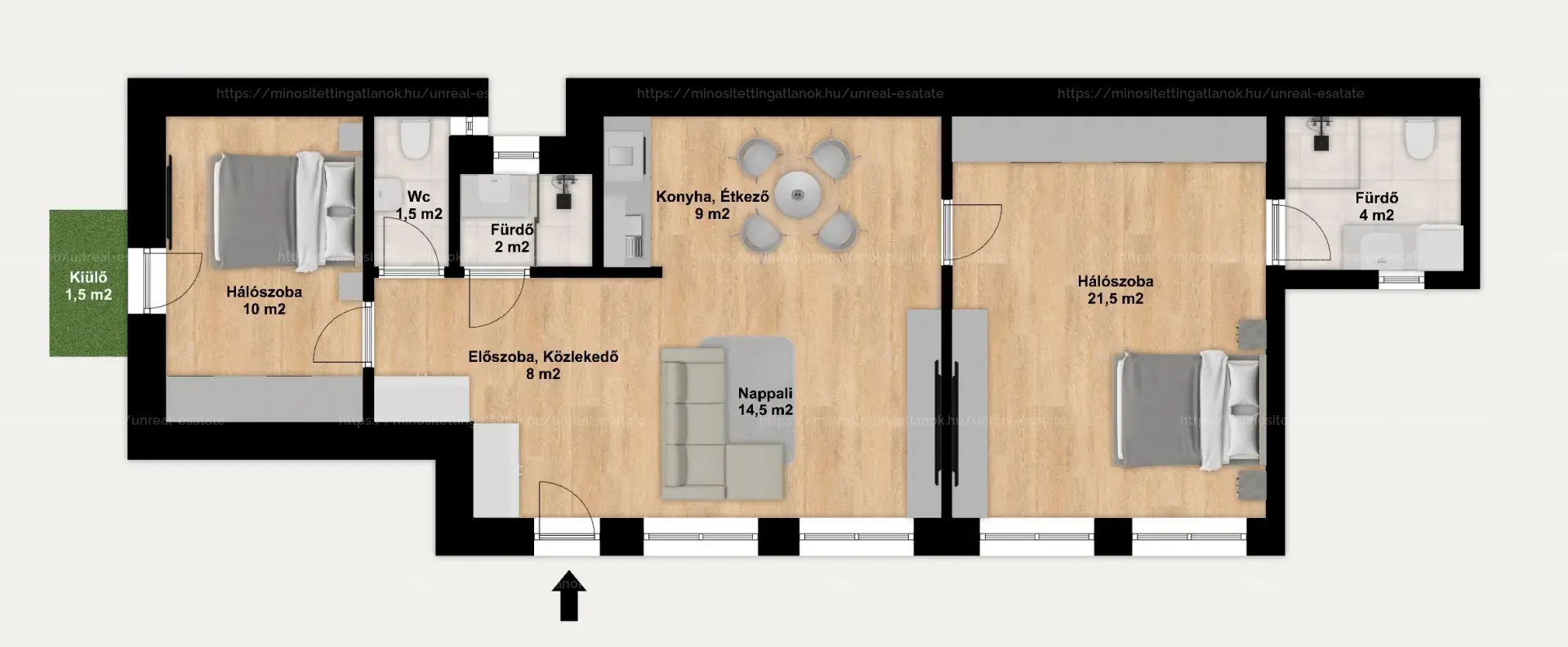 - Nappali + 1 hálószoba (+1 hálószoba könnyen kialakítható, amely az alaprajzon látszik)