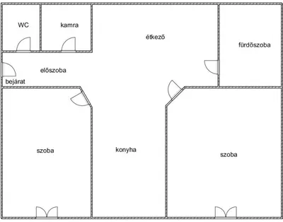 Előszoba, 2 külön nyíló szoba, konyha, kamra, étkező, fürdőszoba és külön WC alkotja.