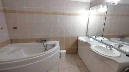 A nagy fürdőszobában sarokkád, dupla mosdó, toalett és mosógép található, a másikban zuhany, wc és mosdó.