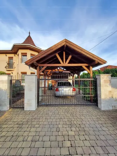 További parkolási lehetőség kerten belül a frissen elkészült, látványos, garázs előtti fedett gépkocsi beálló.