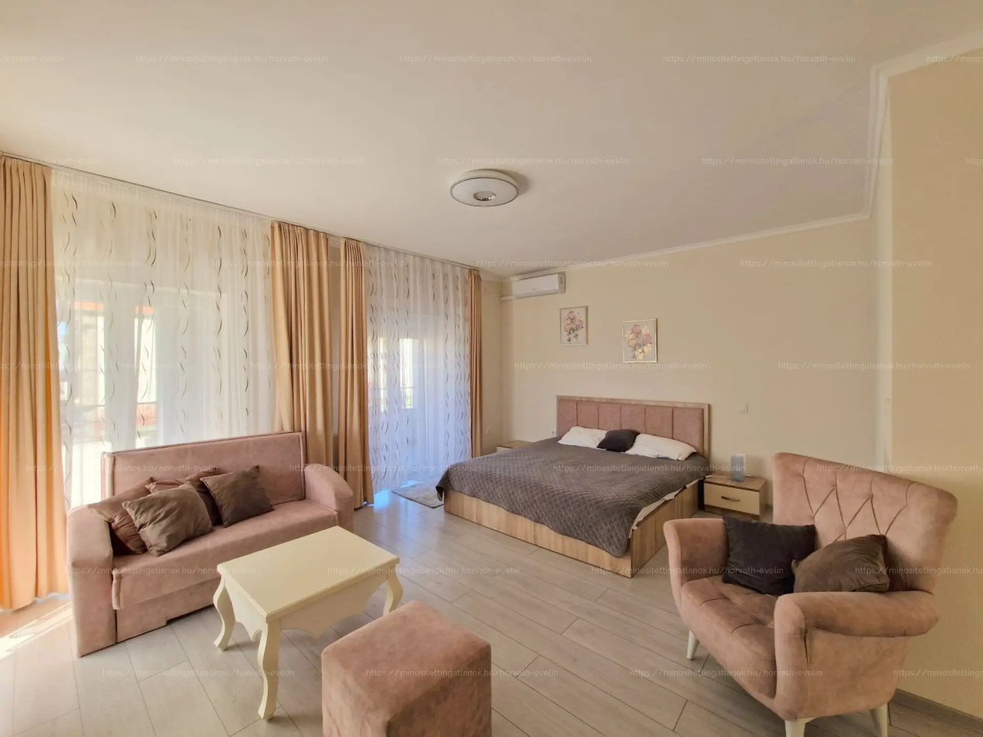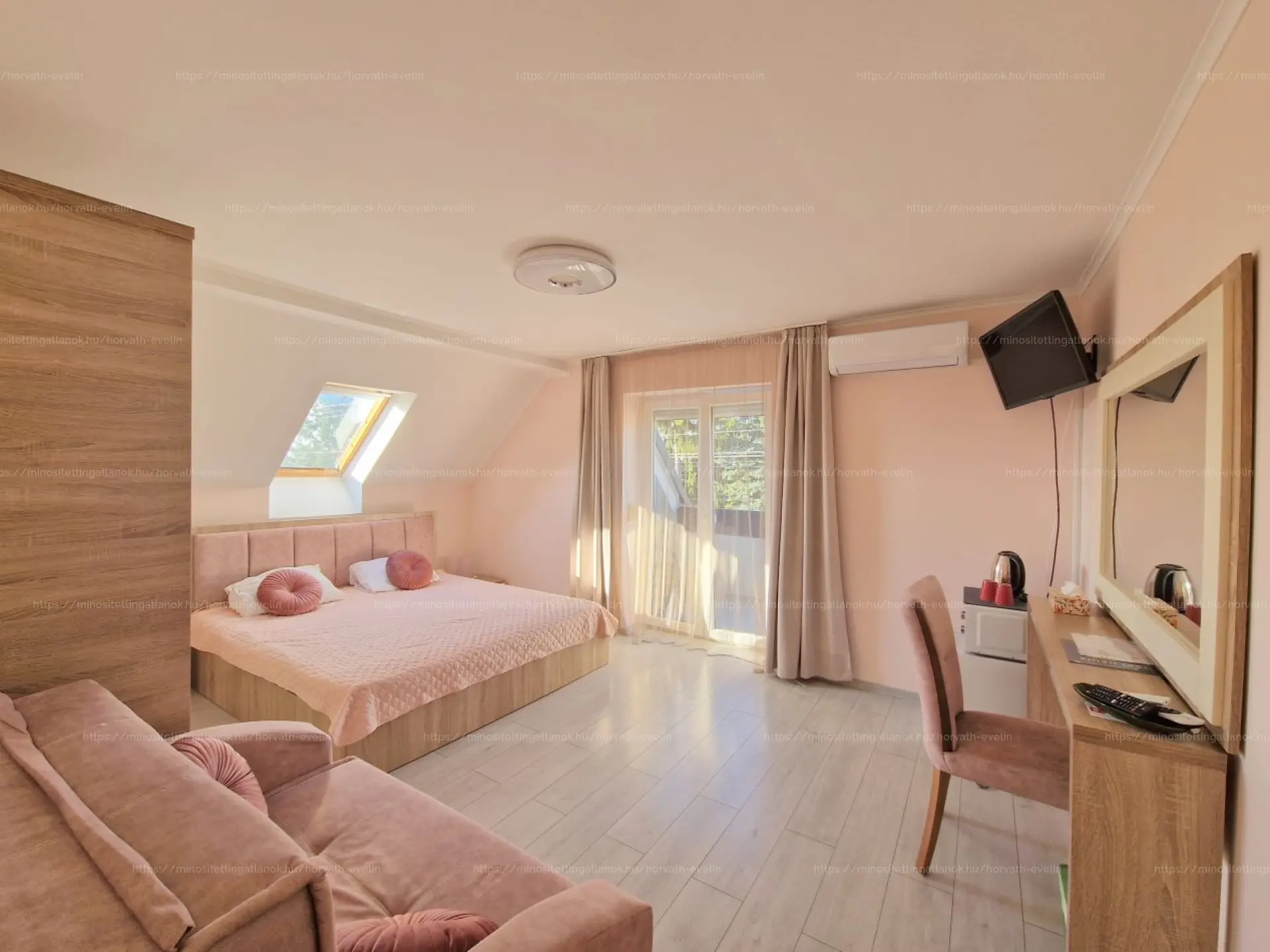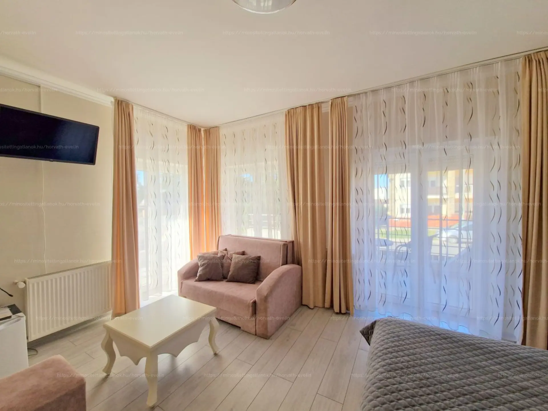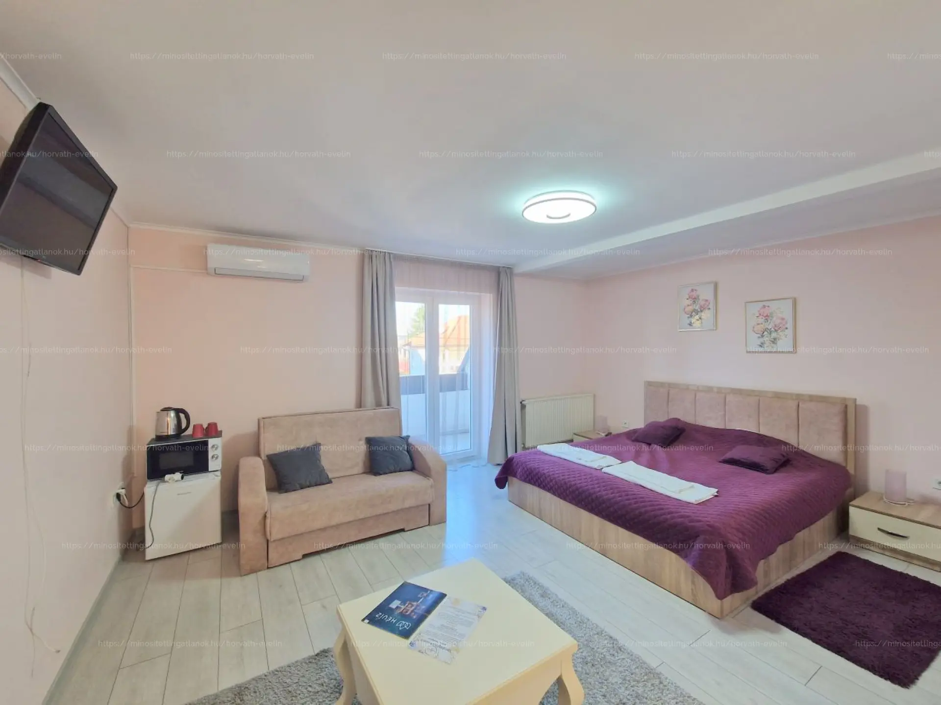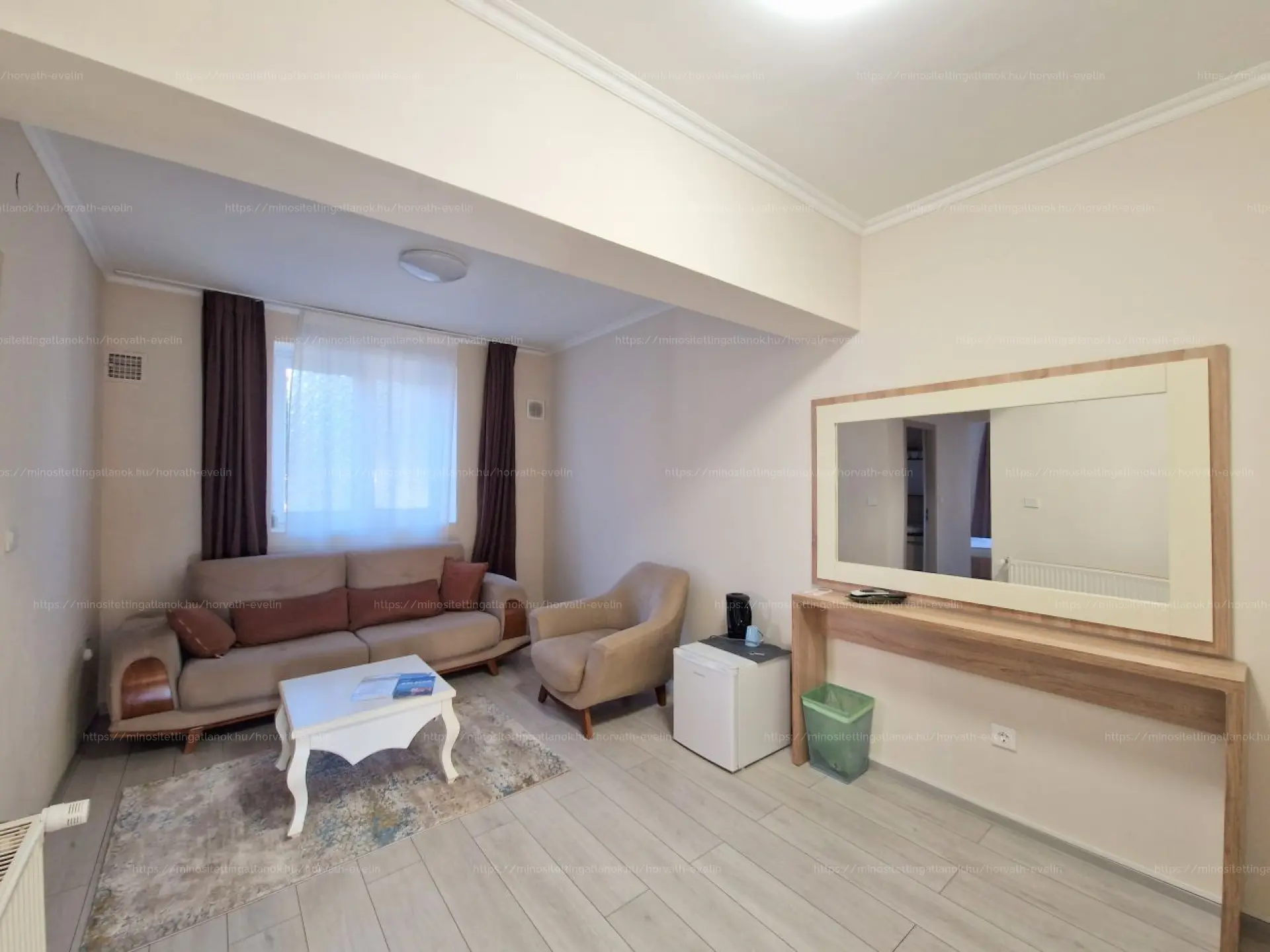 - törölközővel, hajszárítóval, szekrénnyel és hútőszekrénnyel felszerelt.