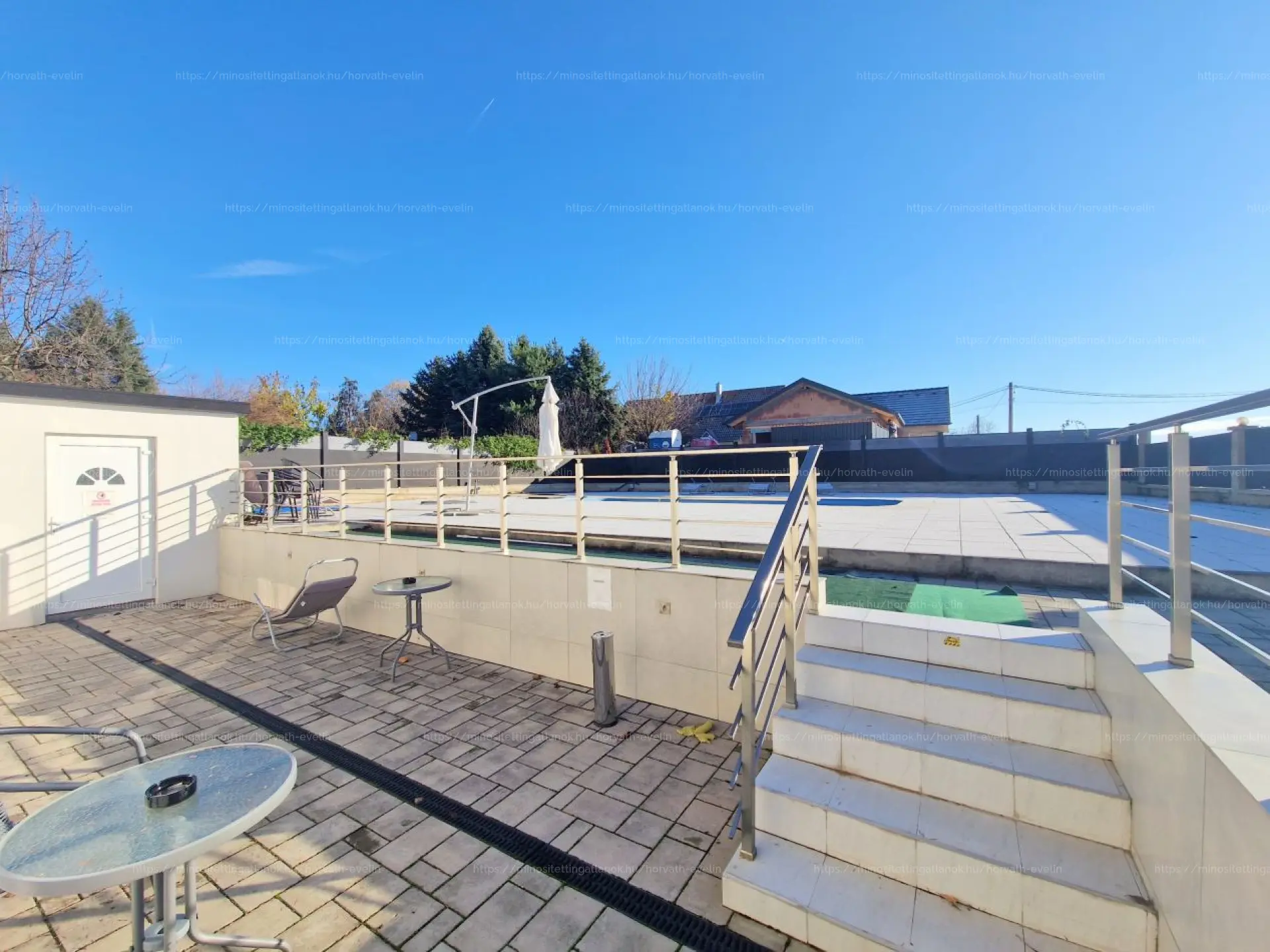 A 665 m2-es belátásmentesen körbekertelt területen található a medence, az azt kürül vevő napozó terasz valamint egy tárolásra alkalmas helyiség is.