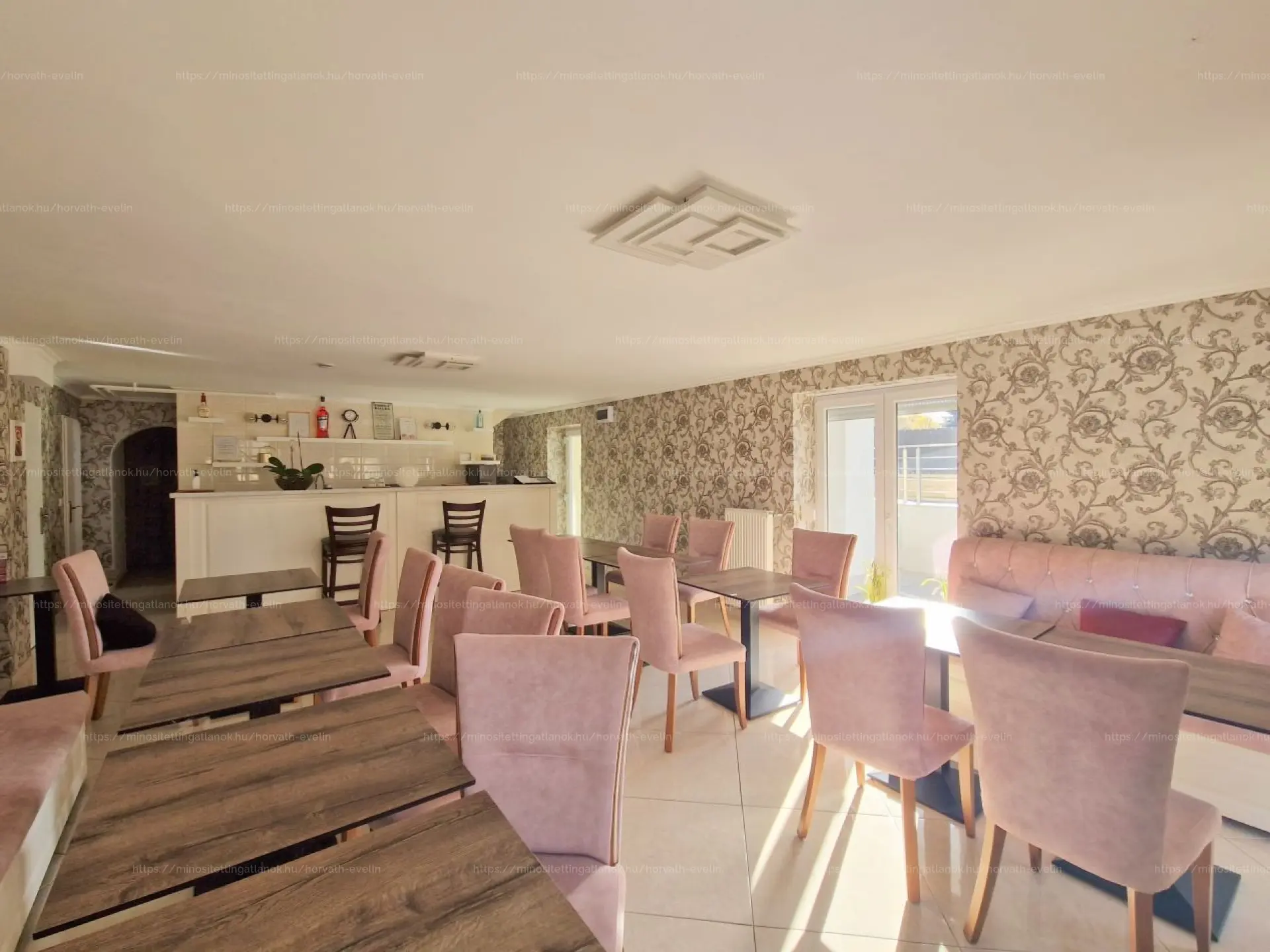 - A FÖLDSZINTEN: egy világos előtérnek, egy közel 50 m2-es, cca. 30 férőhelyes "reggeliztető" résznek, melyen óriás ablakfelületek találhatók, így a benapozottság mindig garantált.