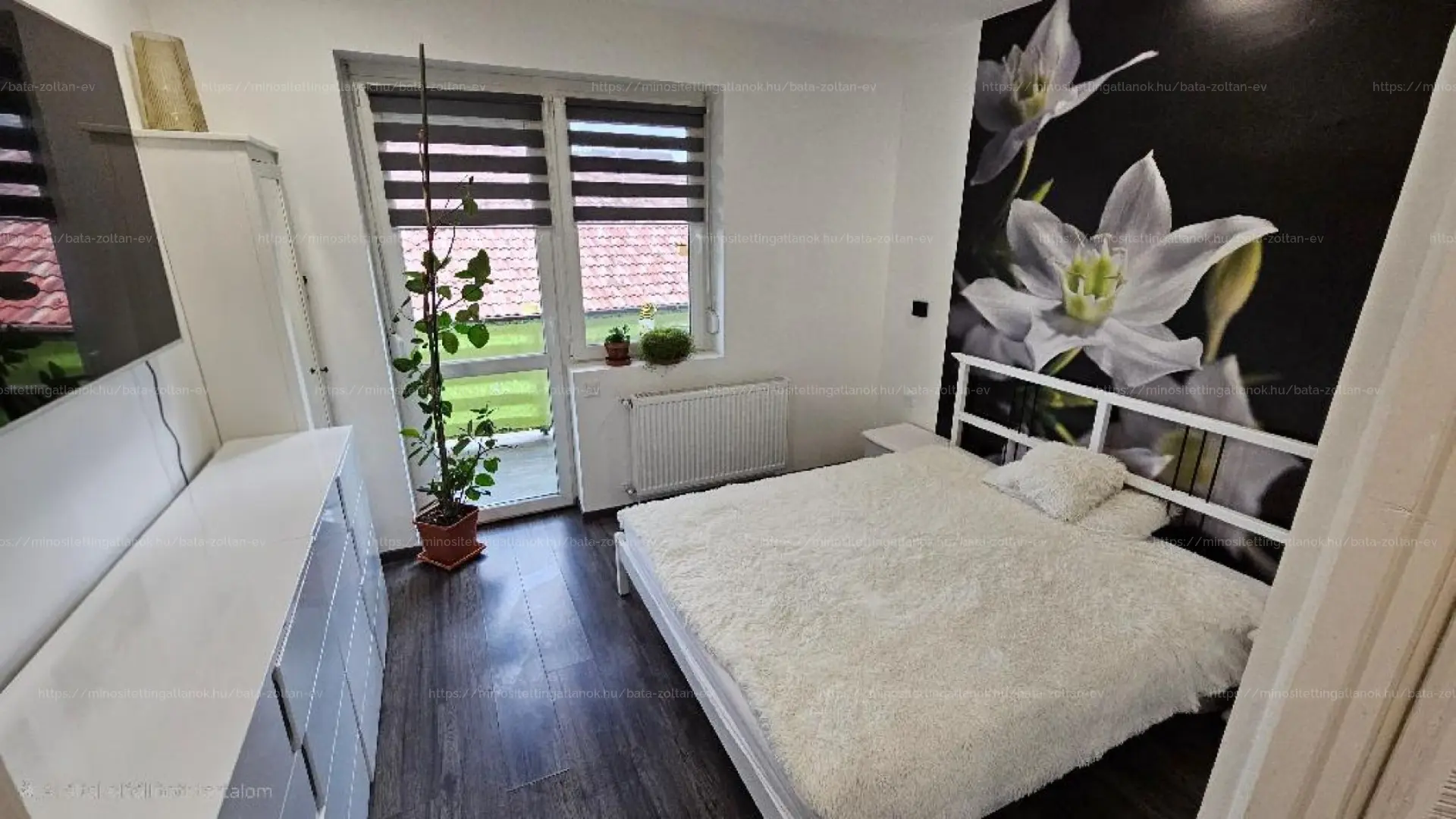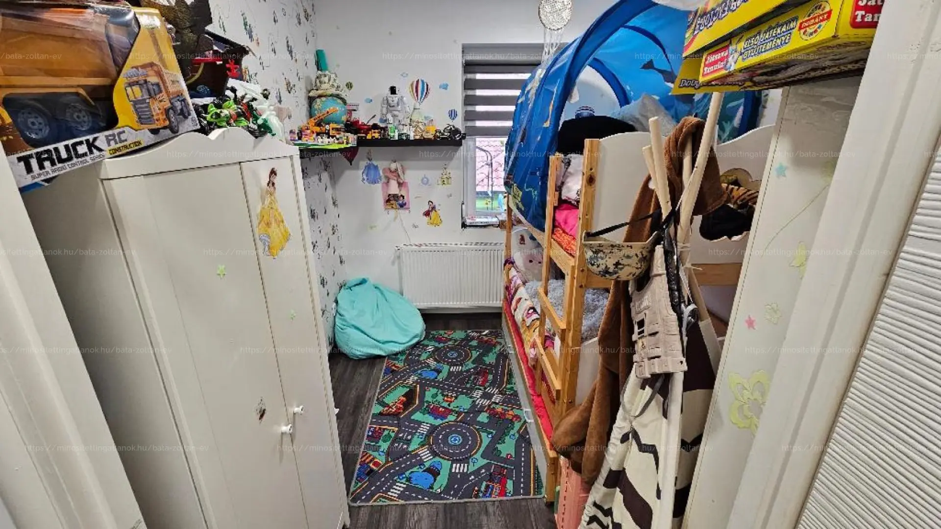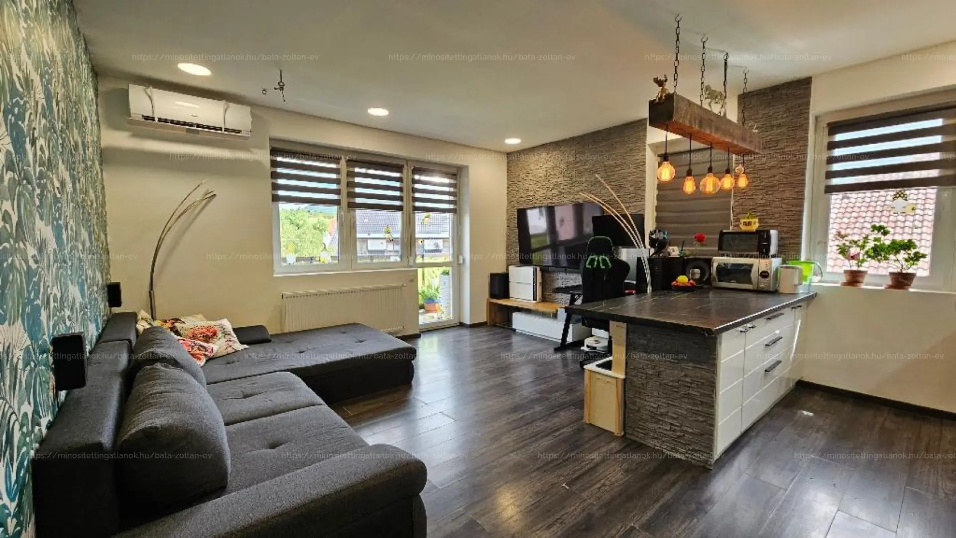 Heves megye, Almagyar városrész, 128/108 nm-es, jó állapotú, örökpanorámás (Eged-hegy), duplakomfortos, REZSIMENTES lakás eladó. A belső kétszintes ingatlan egy 2021-ben átadott, ytong falazatú (50 cm), háromlakásos sorház első emeletén helyezkedik el. A bejárat és az előszoba a földszinten található. Az emeleten amerikai konyhás nappalit, két hálószobát, fürdőszobát (sarokkáddal és zuhanyzóval), WC-t, háztartási helyiséget, közlekedőt és két erkélyt (16 nm, 7 nm) alakítottak ki, míg az idei évben beépített tetőtérben három szoba, fürdőszoba és közlekedő kapott helyet. A lakás saját használatú udvarral/kerttel rendelkezik, melyet a nappaliból nyíló erkélyről, lépcsőn közelíthetünk meg. Az ingatlan energiaellátását napelemek biztosítják, költségmentessé téve a fűtést és az összes elektromos készülék használatát is. A fűtésről elektromos kazán gondoskodik radiátorok segítségével, a komfortérzetet hűtő-fűtő klímák (3,5 kW) növelik. A meleg vízellátást villanybojler biztosítja. Háromrétegű műanyag ablakai redőnnyel szereltek. A lakáshoz, négy autó parkolását biztosító nyílt beállót alakítottak ki, melyből kettő fedett. Méretének, kialakításnak és elhelyezkedésének köszönhetően az ideális otthon lehetőségét kínálja többgyermekes család számára. Megegyezés szerint, a vételárba, kisebb lakás beszámítására van lehetőség.
