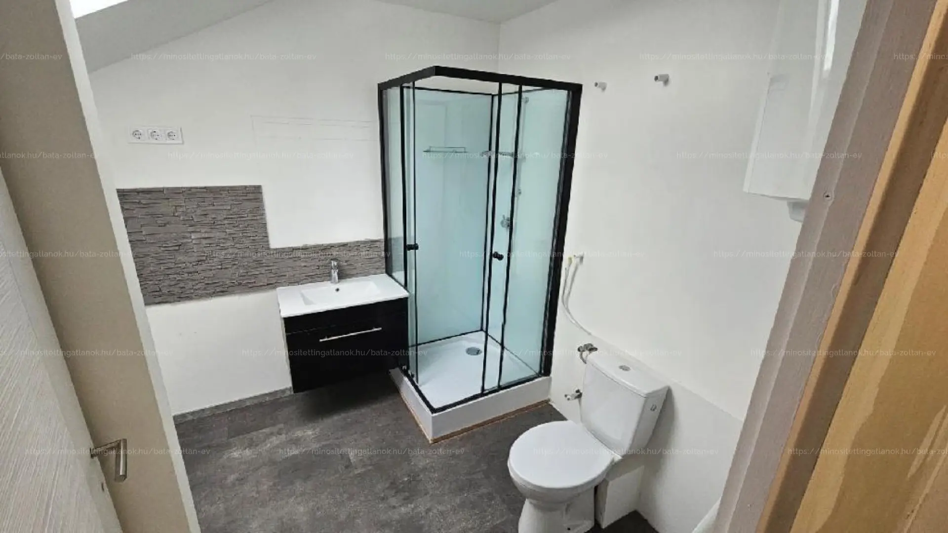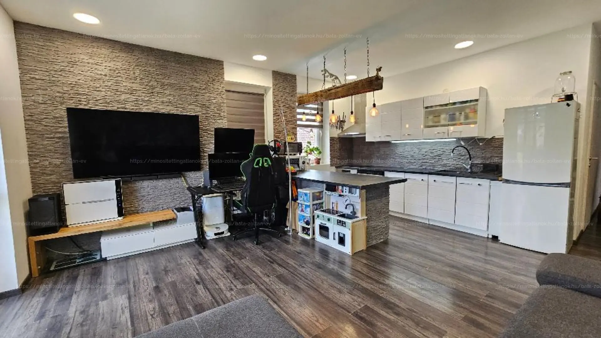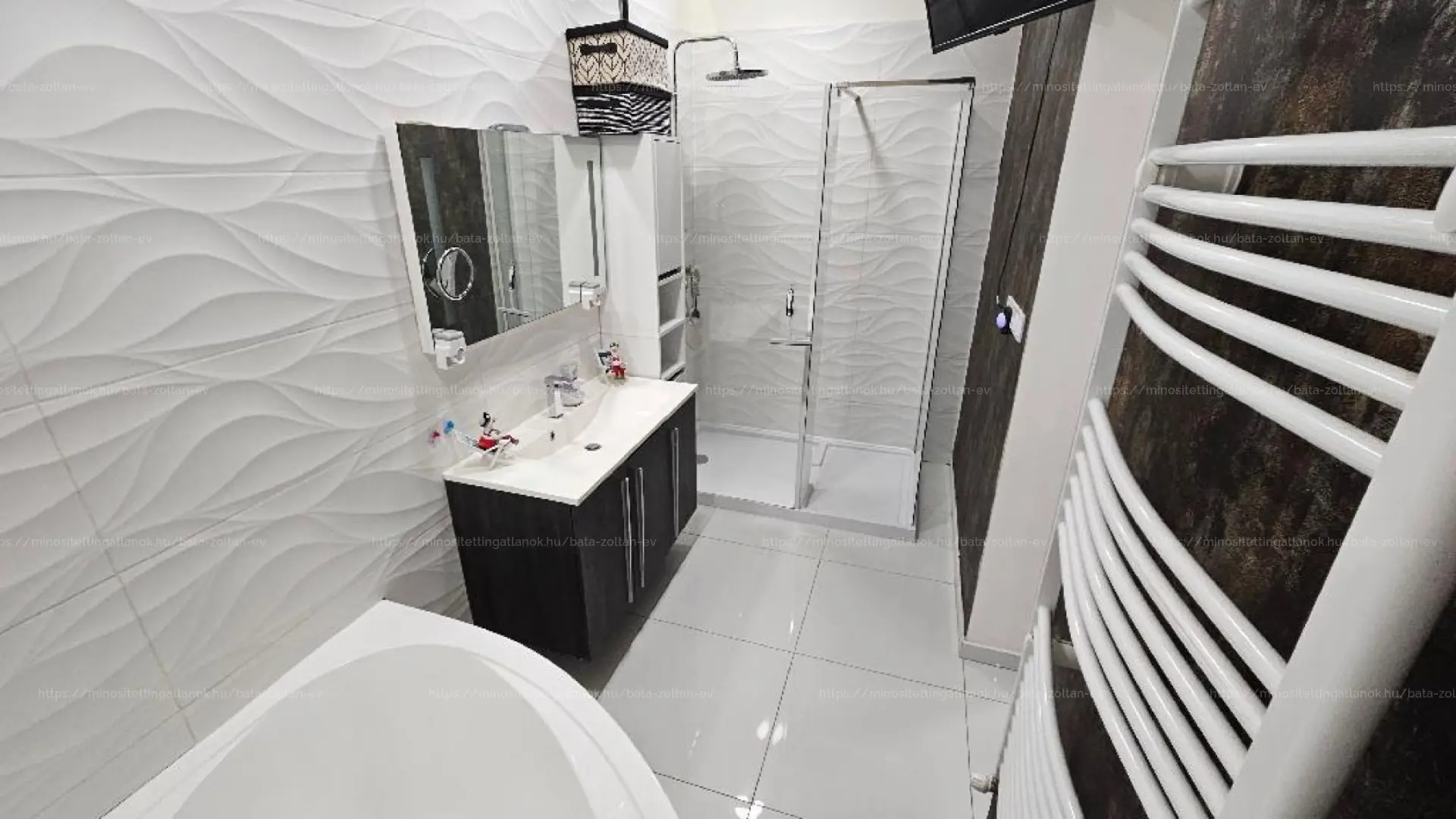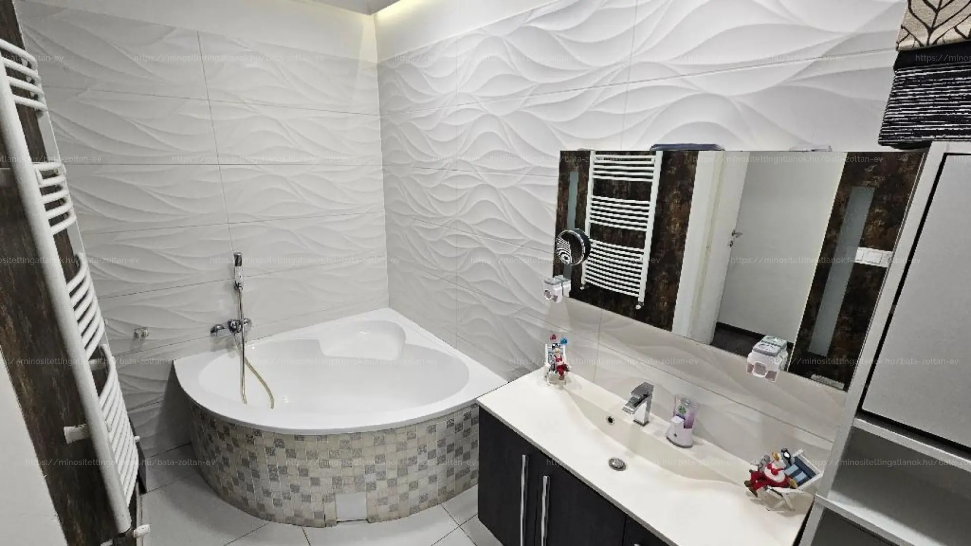 Heves megye, Almagyar városrész, 128/108 nm-es, jó állapotú, örökpanorámás (Eged-hegy), duplakomfortos, REZSIMENTES lakás eladó. A belső kétszintes ingatlan egy 2021-ben átadott, ytong falazatú (50 cm), háromlakásos sorház első emeletén helyezkedik el. A bejárat és az előszoba a földszinten található. Az emeleten amerikai konyhás nappalit, két hálószobát, fürdőszobát (sarokkáddal és zuhanyzóval), WC-t, háztartási helyiséget, közlekedőt és két erkélyt (16 nm, 7 nm) alakítottak ki, míg az idei évben beépített tetőtérben három szoba, fürdőszoba és közlekedő kapott helyet. A lakás saját használatú udvarral/kerttel rendelkezik, melyet a nappaliból nyíló erkélyről, lépcsőn közelíthetünk meg. Az ingatlan energiaellátását napelemek biztosítják, költségmentessé téve a fűtést és az összes elektromos készülék használatát is. A fűtésről elektromos kazán gondoskodik radiátorok segítségével, a komfortérzetet hűtő-fűtő klímák (3,5 kW) növelik. A meleg vízellátást villanybojler biztosítja. Háromrétegű műanyag ablakai redőnnyel szereltek. A lakáshoz, négy autó parkolását biztosító nyílt beállót alakítottak ki, melyből kettő fedett. Méretének, kialakításnak és elhelyezkedésének köszönhetően az ideális otthon lehetőségét kínálja többgyermekes család számára. Megegyezés szerint, a vételárba, kisebb lakás beszámítására van lehetőség.