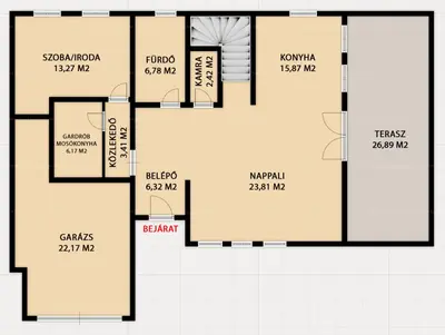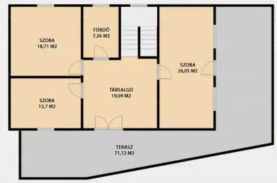 Az alsó szint 78 nm, ahol található egy tágas amerikai konyhás nappali, egy külön nyíló hálószoba, egy fürdőszoba, egy kamra, egy mosókonyha és egy 26,89 m2-es fedett terasz. A felső szint 84,81 nm ahol fellelhető egy társalgó, három jó méretű szintén külön nyíló hálószoba, egy fürdőszoba és összesen 71 m2 terasz is. Így az össz mérete az ingatlannak 211,8 nm, melybe a teraszok alapterületének 50%-a került beszámításra.