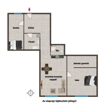 amerikai konyhás nappali · 2 hálószoba · járható gardrób · fürdőszoba · külön WC kézmosóval · tágas közlekedő