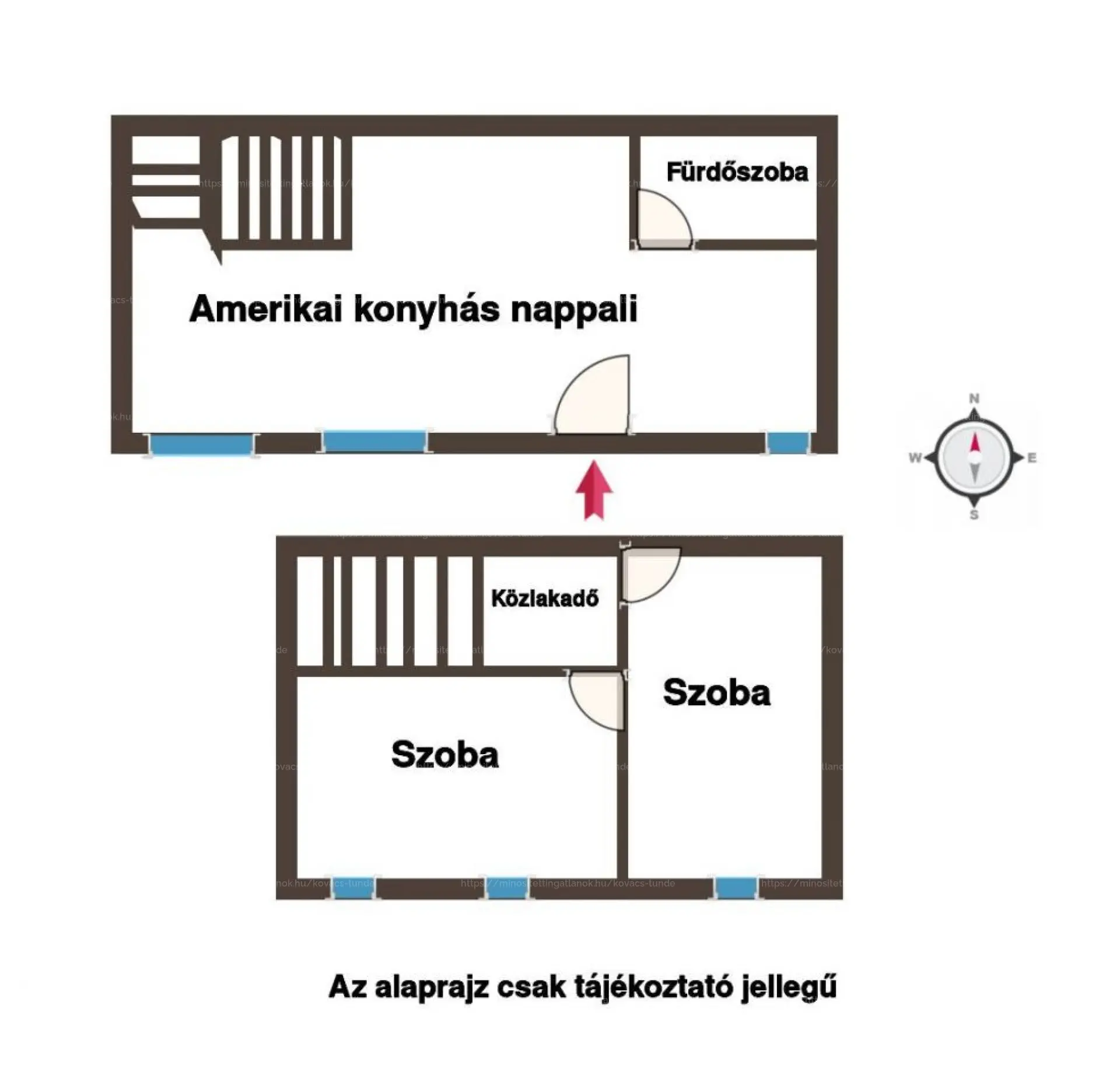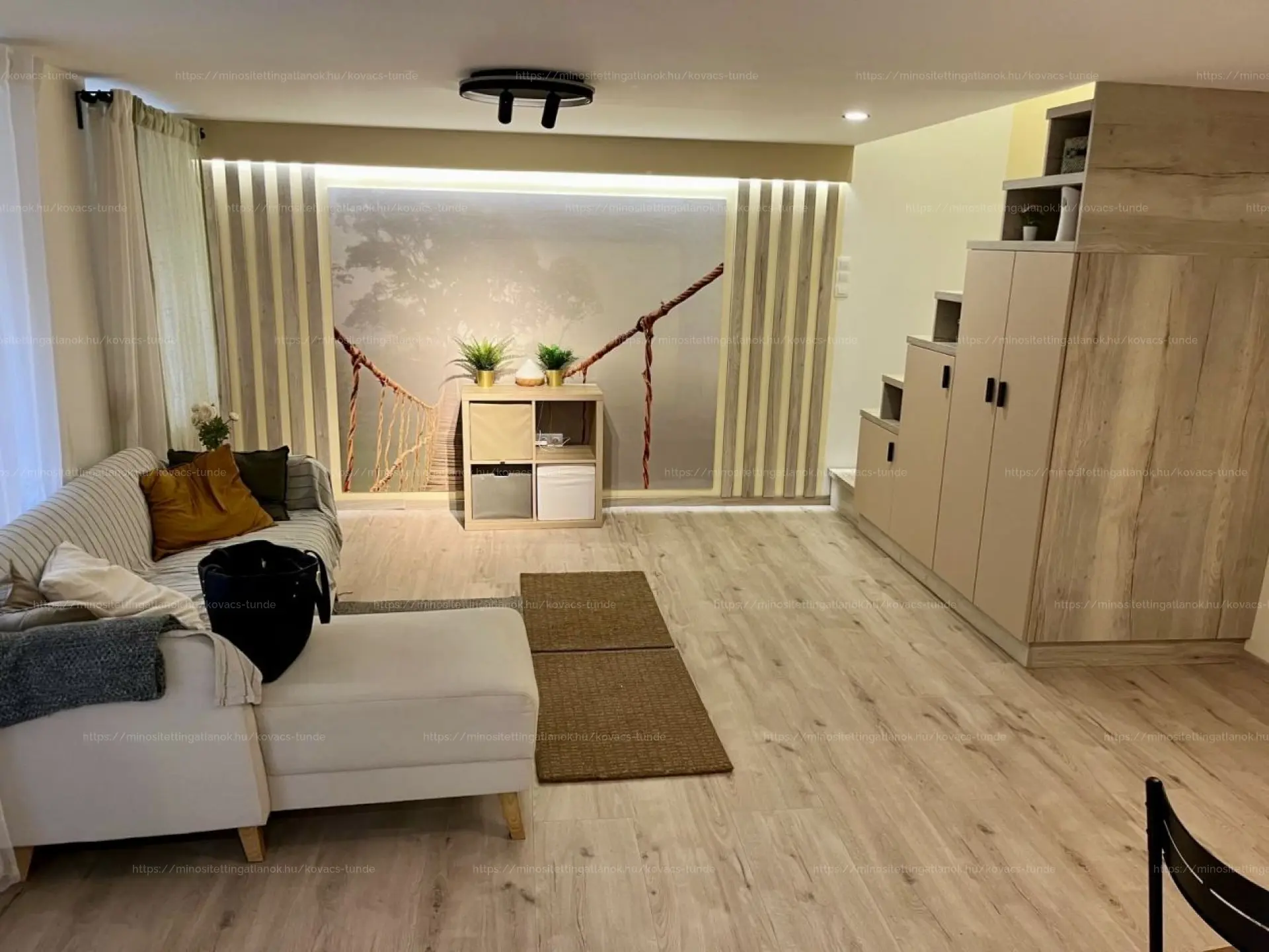 a lenti szinten tágas amerikai konyhás nappali és fürdő, fent pedig két hálószoba biztosít kényelmet akár pároknak, akár kis családnak.