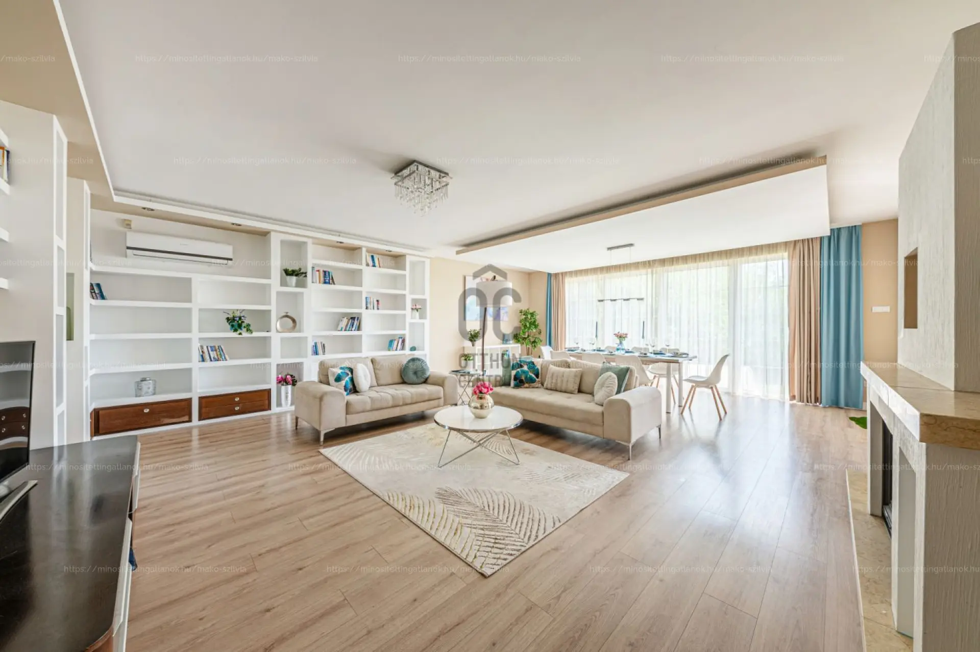 • Светлая гостиная-столовая, идеальная для семейных встреч и ужинов с друзьями, с атмосферным камином и большими стеклянными поверхностями, создающими естественную связь с садом