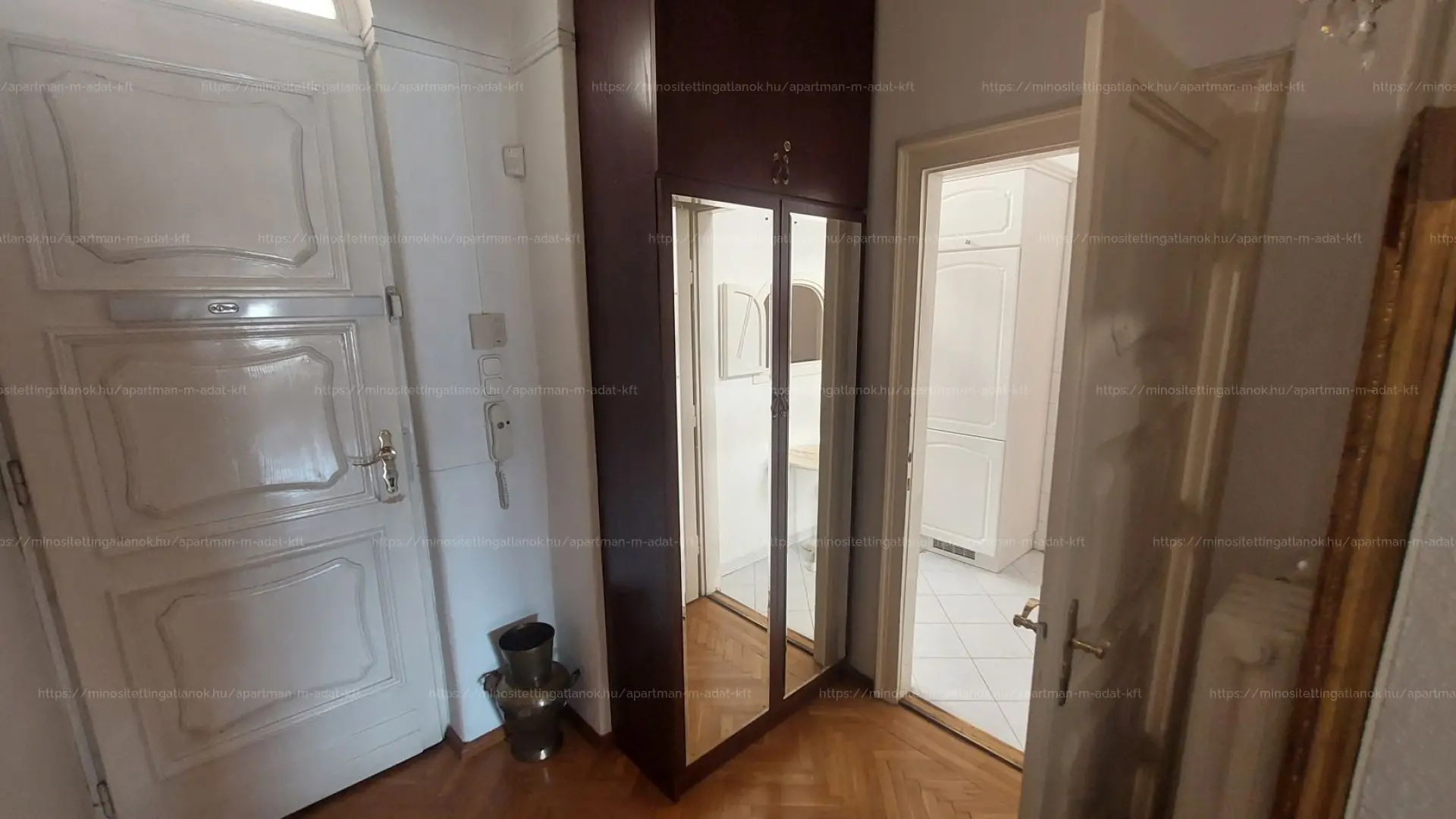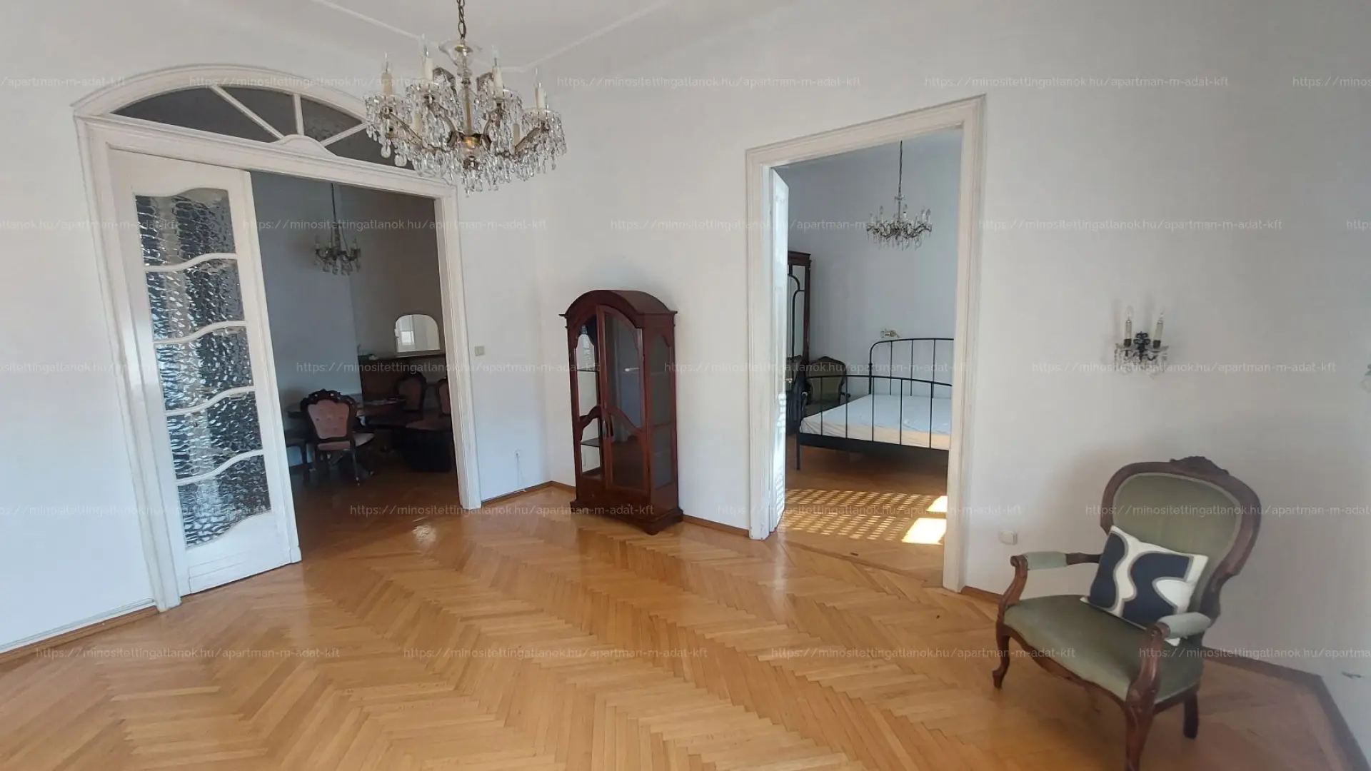 A lakás 82 m2 alapterületű, 3 szoba (24, 20 és 8 m2), 16 m2-es hall, külön konyha kamrával, fürdőszoba. A napfényes nappali és nagy hálószoba a Parlamentre, a kisszoba és a konyha pedig csendes belső udvarra néz. A bejárat előtt külön lezárt saját használatú folyosórész található.