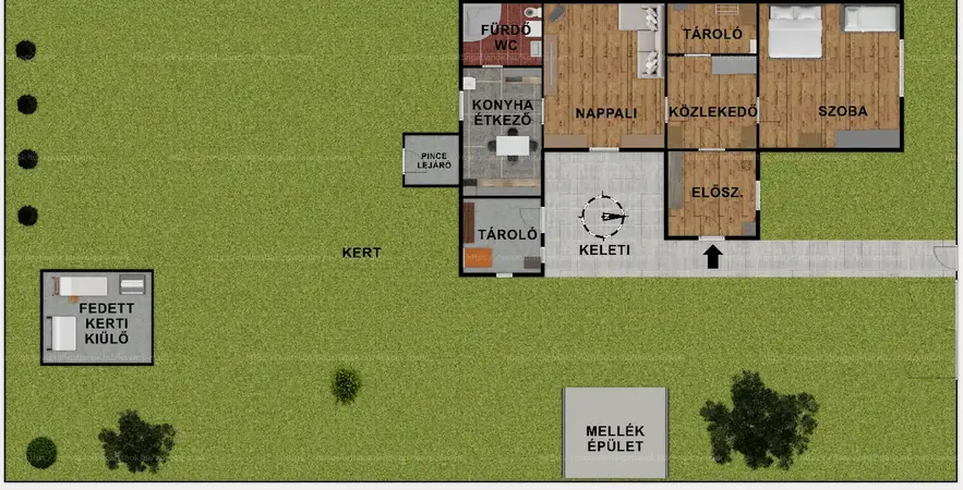 Előszoba, közlekedő, étkezős konyha, 2 db külön nyíló hálószoba, kádas fürdőszoba, kamra, fedett terasz, külső tároló, melléképület.