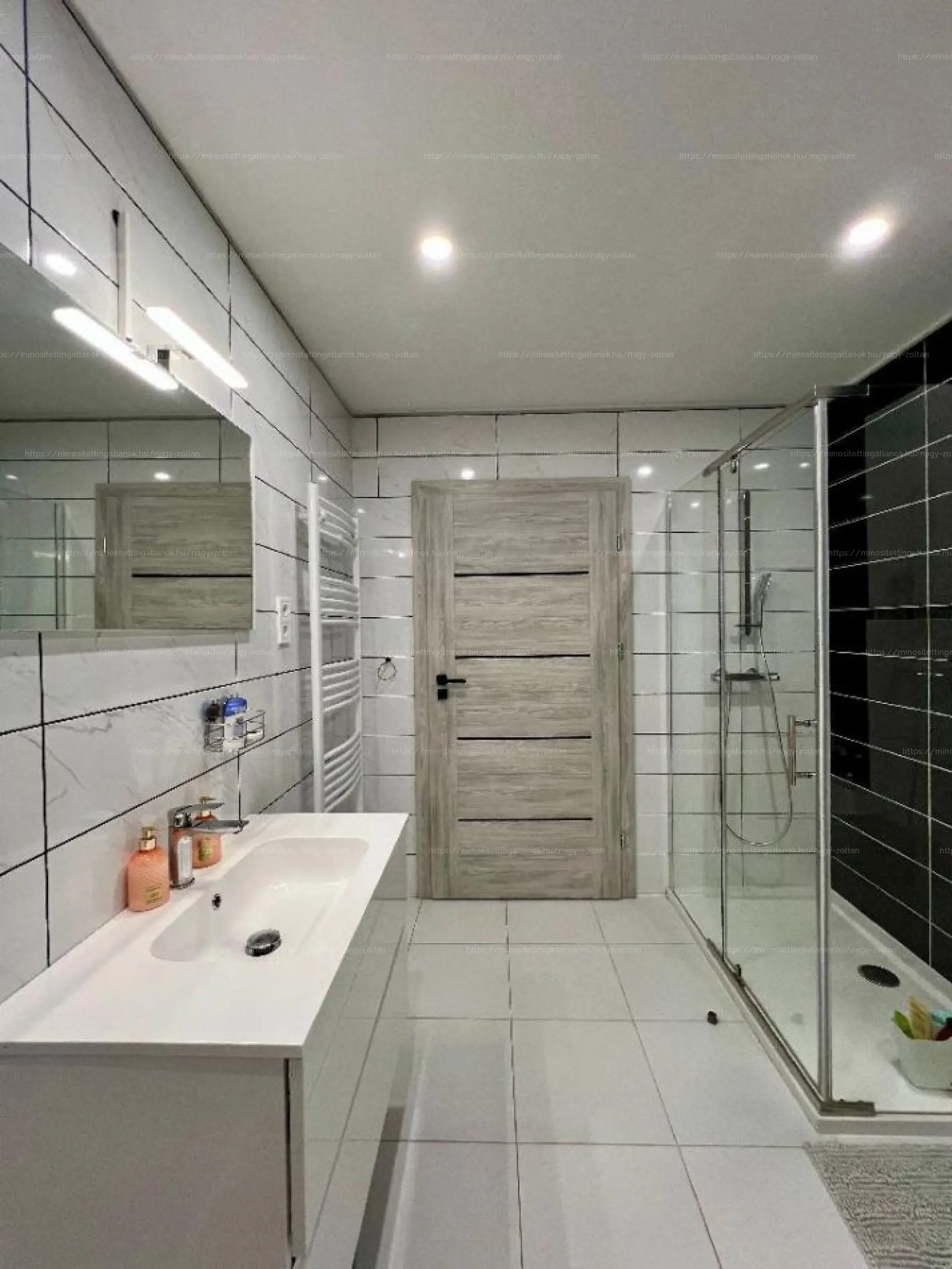 A fő hálószoba saját zuhanyzós fürdőszobával és WC-vel rendelkezik, míg a másik fürdőszobában sarokkád, WC és zuhanyzó található.