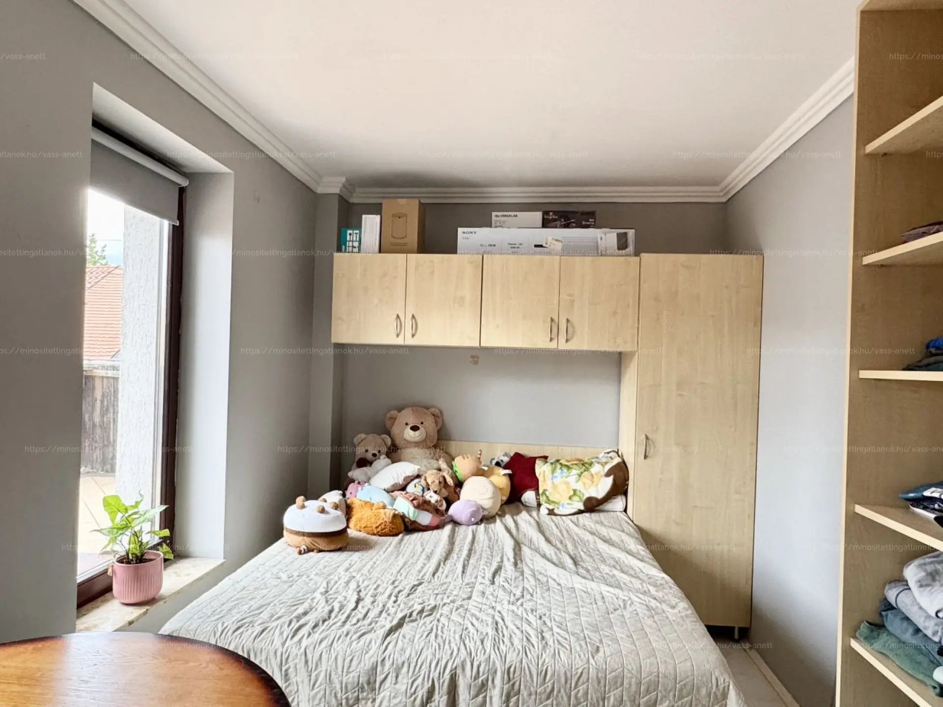 Az emeleten hatalmas amerikai konyhás nappali található, hangulatos kandallóval, 2 szoba beépített bútorral, gardrób, tágas fürdőszoba (fürdőkáddal, zuhanyzóval és dupla mosdóval), különálló toalett piszoárral, valamint mosókonyha.