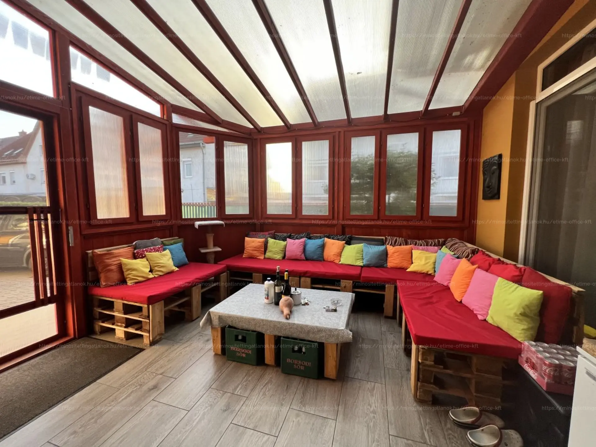 - FEDETT, TÉLIESÍTETT TERASZ (új burkolat, minőségi faanyag, levehető ablaktáblák, árnyékoló, szúnyogháló),