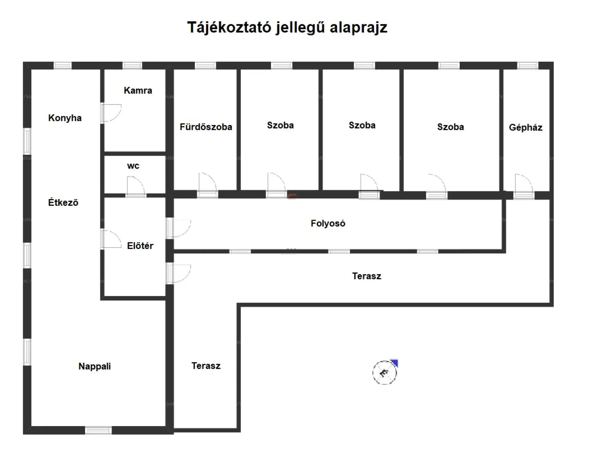 A 110 m2-es lakóház, 1079 m2-es telken helyezkedik el. Praktikus helyiség elosztása: előtér, nappali, konyha-étkező, 3 szoba, kamra, folyosó, gépház, fürdőszoba, wc, valamint egy 40 m2-es terasz.