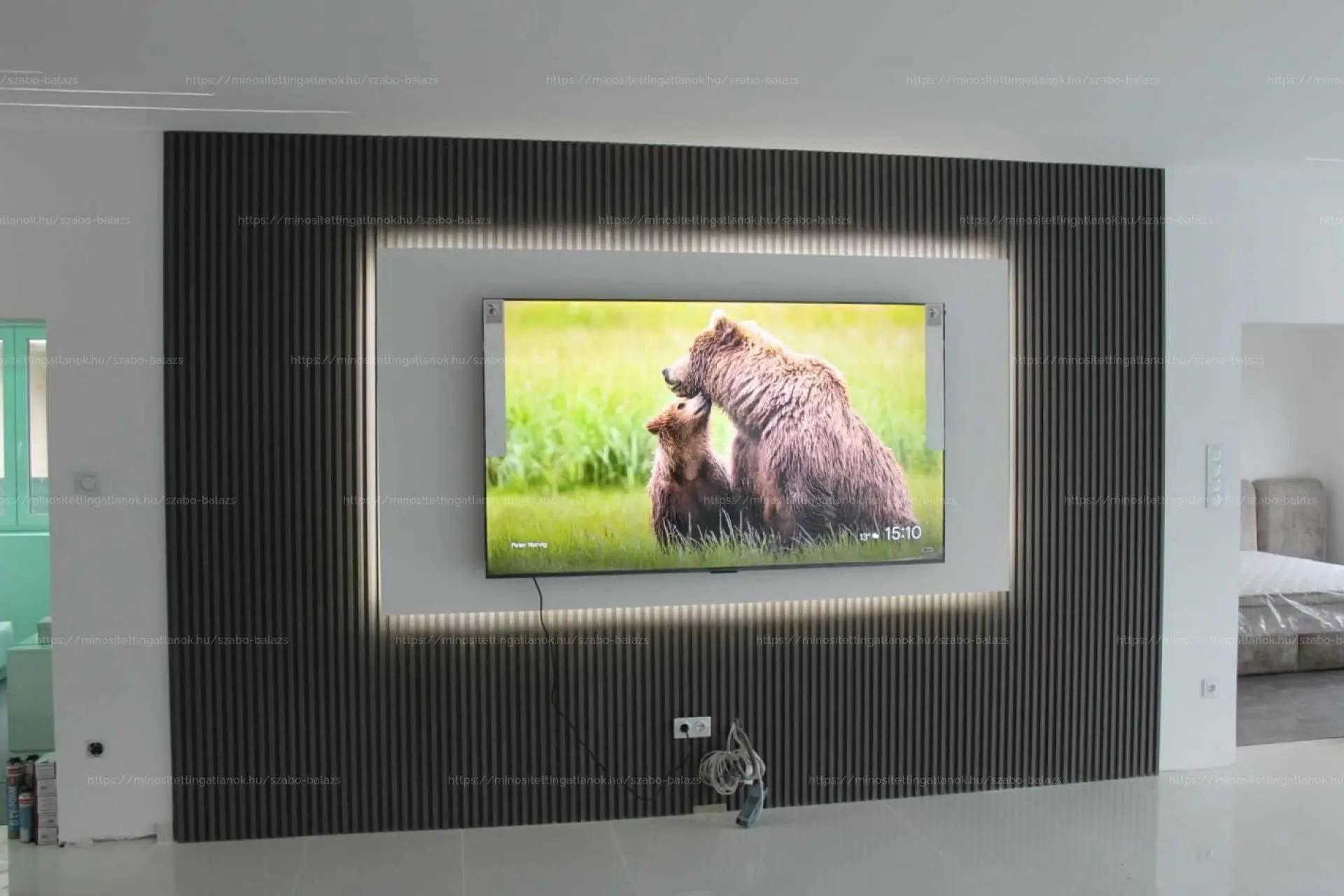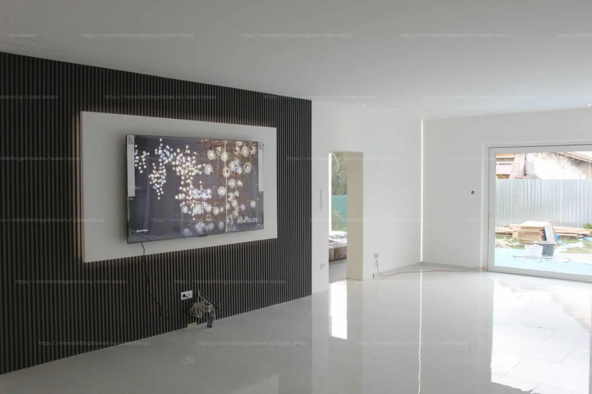 A nappaliban egy impozáns tévéfal kapott helyet, beépített LED hangulatvilágítással és látványkandallóval, ami különleges, otthonos hangulatot biztosít.