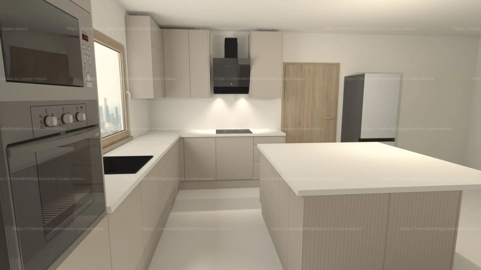 A tágas, 65,5 m²-es amerikai konyhás nappali a ház központi eleme, amelyet a nagy üvegfelületek és a teraszkapcsolat tesznek igazán világossá és hívogatóvá.