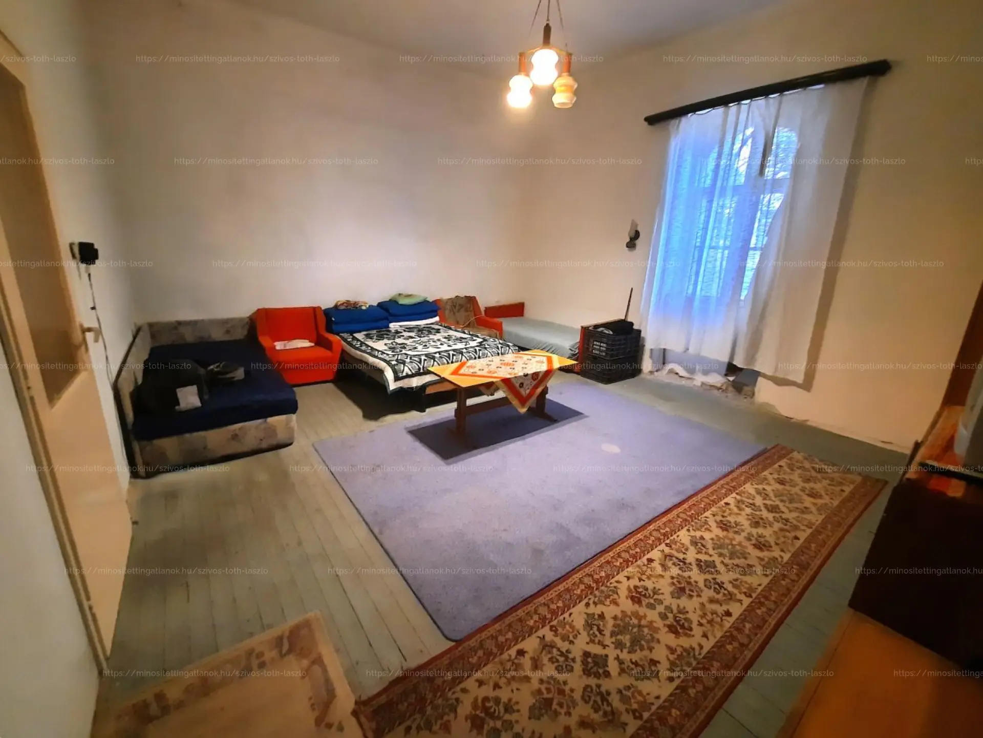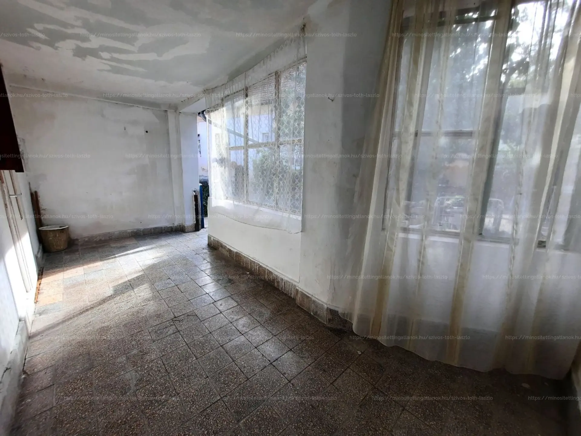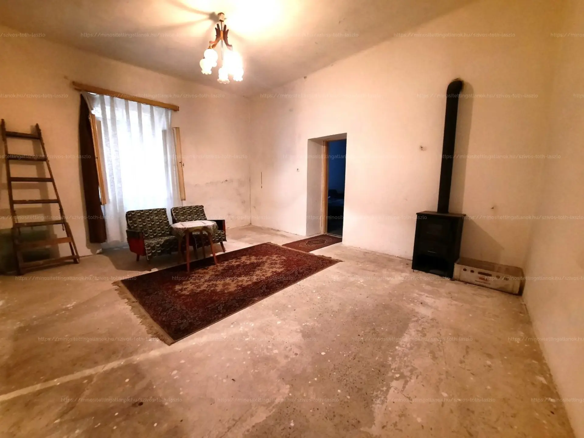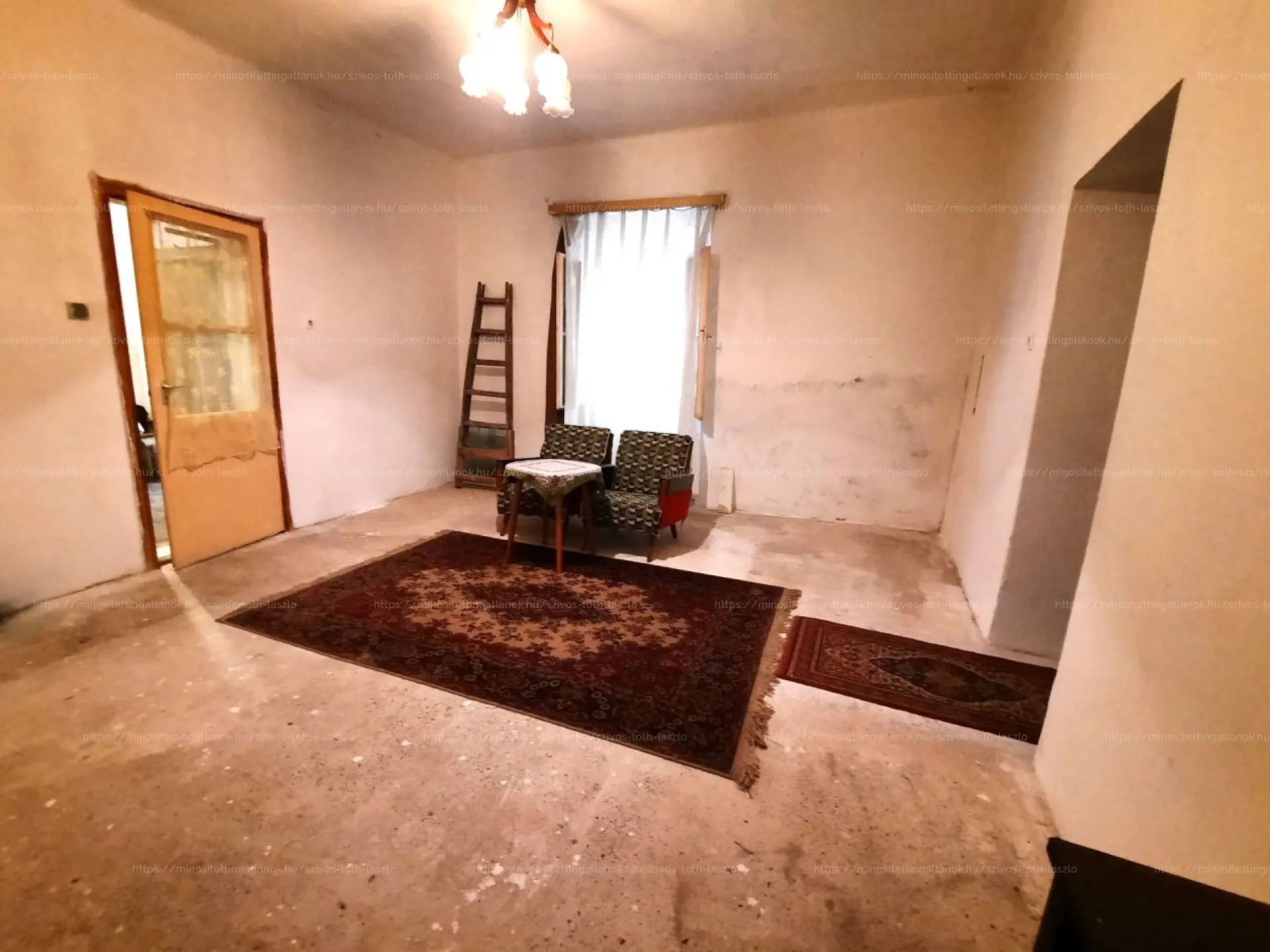 Az otthon két szobával, egy konyhával, egy külön nyíló WC- helyiséggel, egy kamrával és egy fedett terasszal rendelkezik. Az egyik szoba hajópadló-, a másik szoba beton-, a többi helyiség járólap-burkolatot kapott. A külső- és belső nyílászárók eredetiek, fából készültek, normál állapotban vannak.