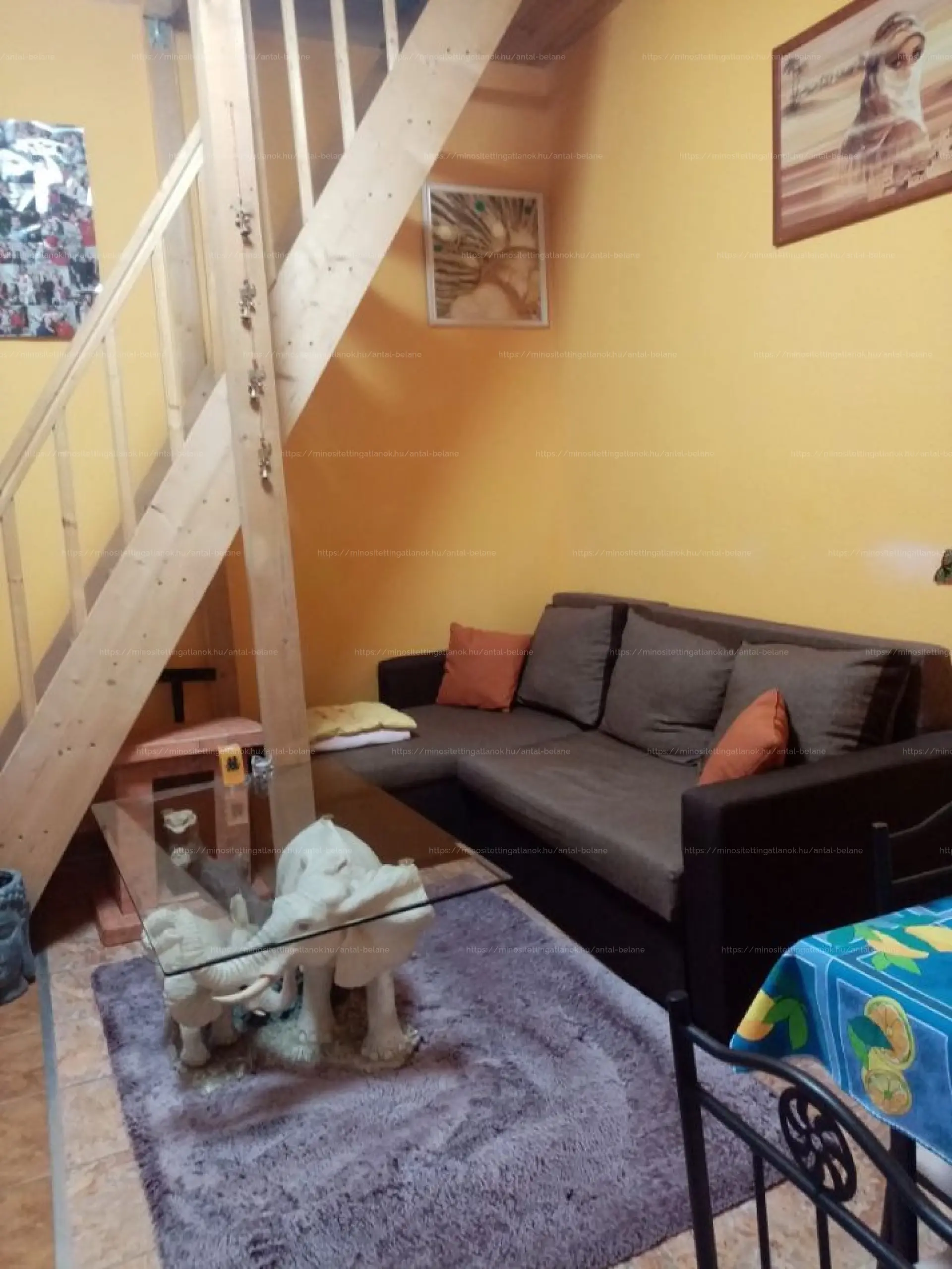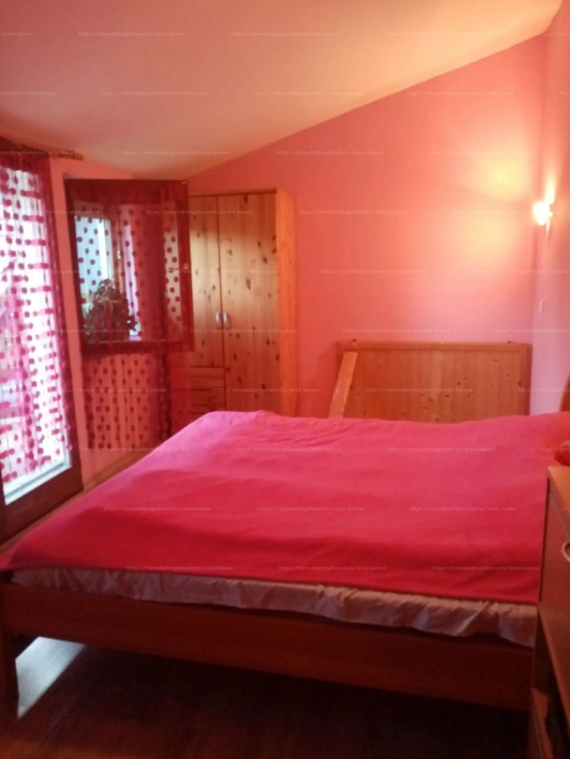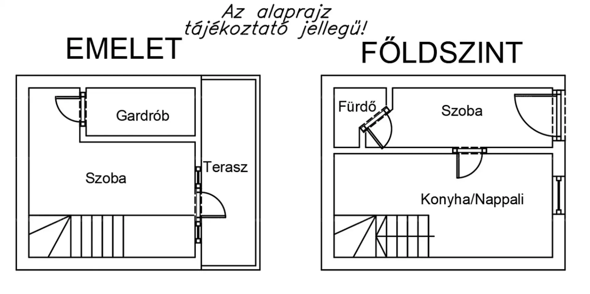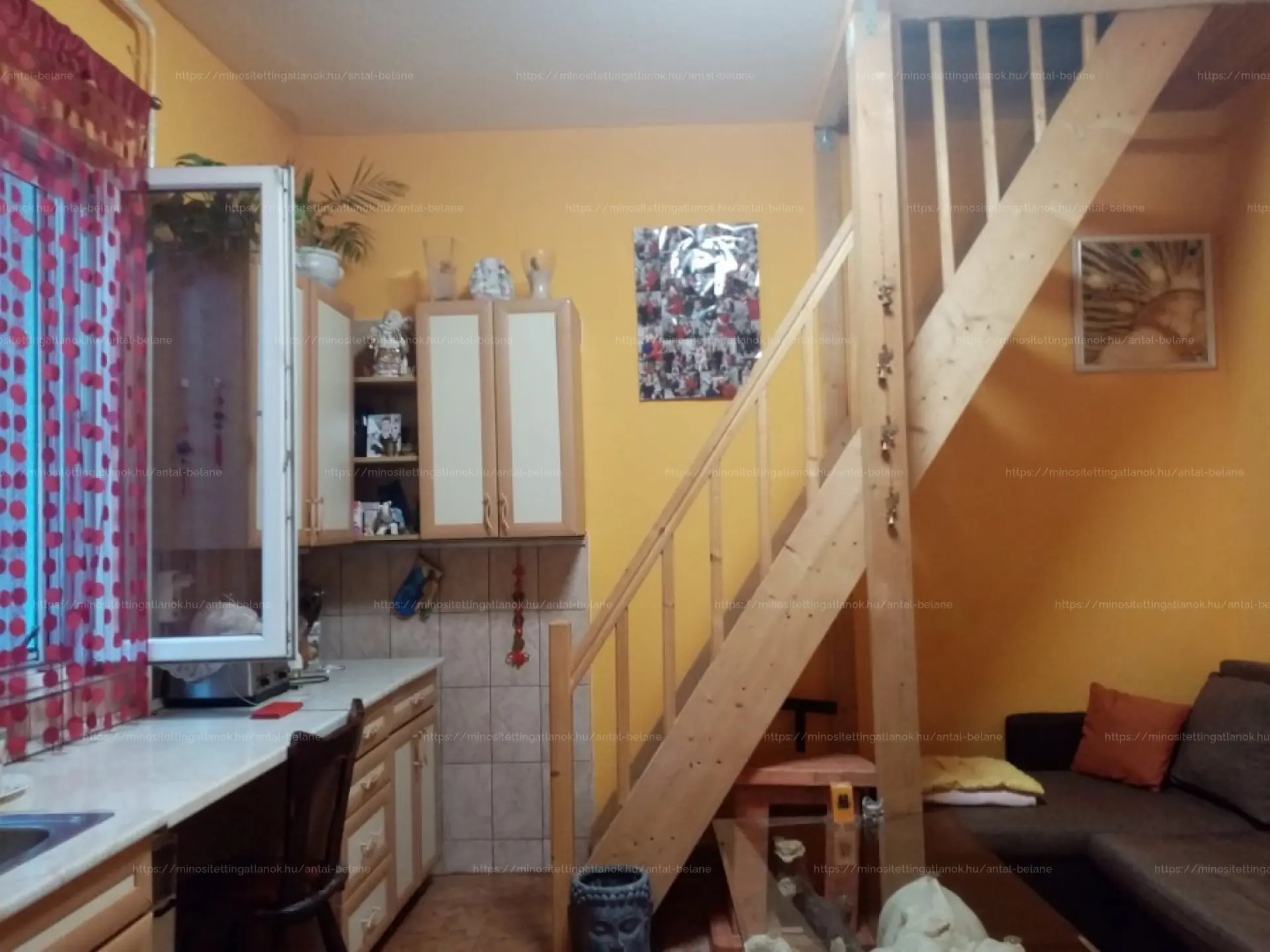 A felsõ szinten tágas szoba, egy félszoba és erkély van.