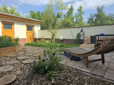 Kert: Saját fúrt kút biztosítja az úgynevezett önfenntartó kert vízellátását.