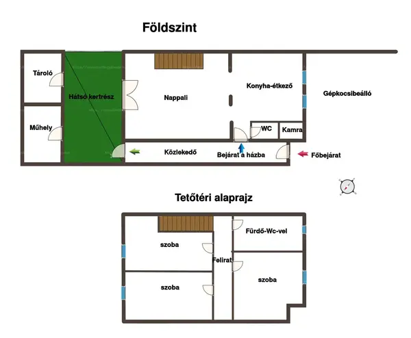Tárolás: Hőszigetelt padlástér, és egy szigetelt kamra/műhely a kert hátsó részében.