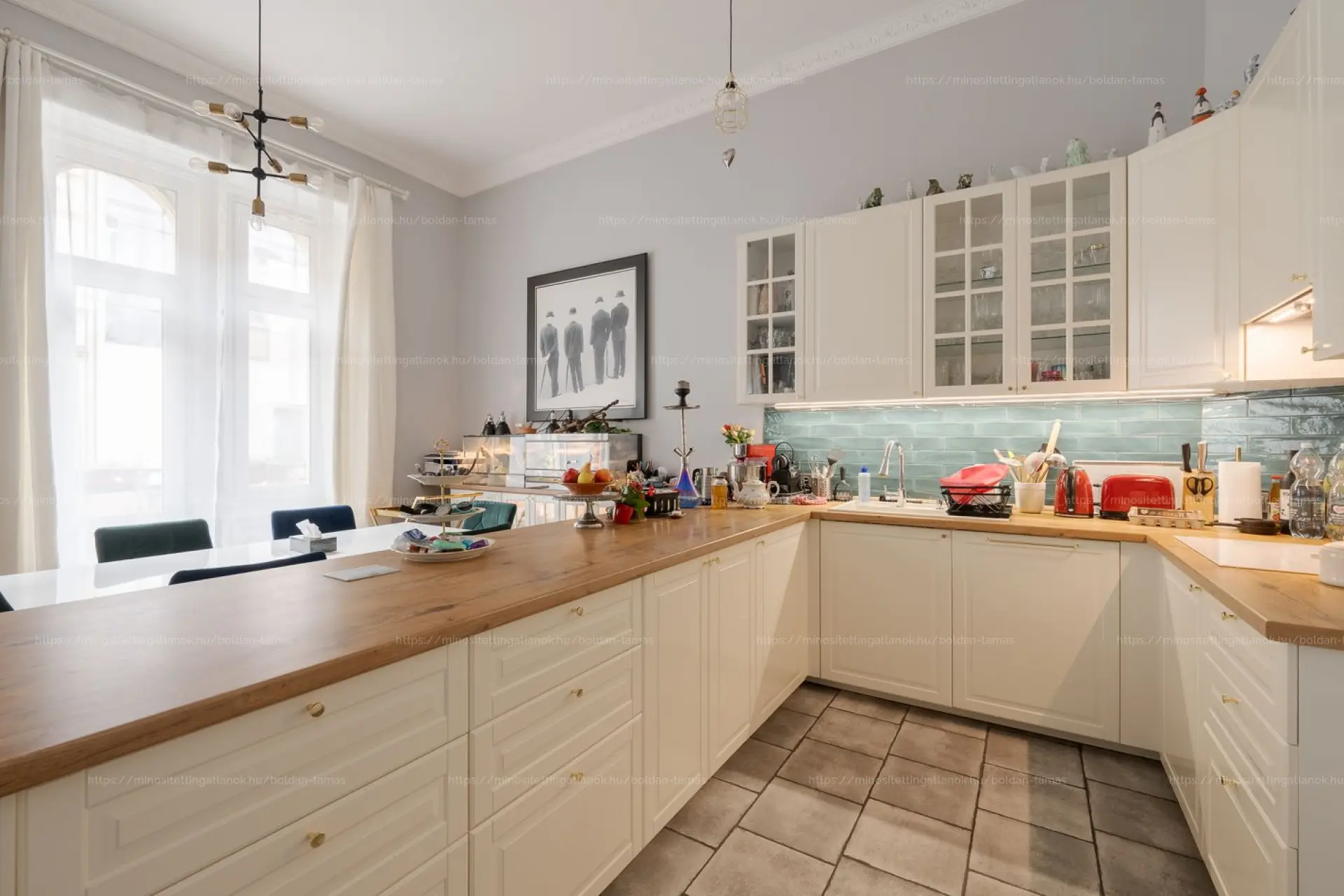 Praktikus konyha + kamra: beépített sütő, mikró, indukciós főzőlap, beépített mosogatógép, kéménybe kötött elszívó – a gépek a vételár részét képezik; a tárolást méretes spájz segíti.