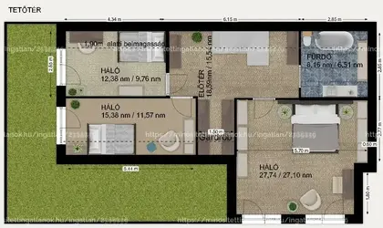 Az épület kétszintes, összesen 5 szobával (nappali-étkező: 44 m2, szobák: 27, 15, 14 és 12 m2), és két fürdőszoba-WC (az egyikben zuhanyzó a másikban fürdőkád) található az ingatlanban. tágas előtér, az emelten gardrób található a további kényelem szolgálatában. A tágas nappalihoz kertkapcsolatos terasz (12 m2), kiváló helyszínt biztosít a pihenéshez. A kellemes belső klímáról hőszivattyús mennyezet hűtés-fűtés, a nappaliban padlófűtés és a 20 cm-es szigetelés gondoskodik. Az ingatlan energetikai besorolása kiemelkedően kedvező, A+ kategóriájú.