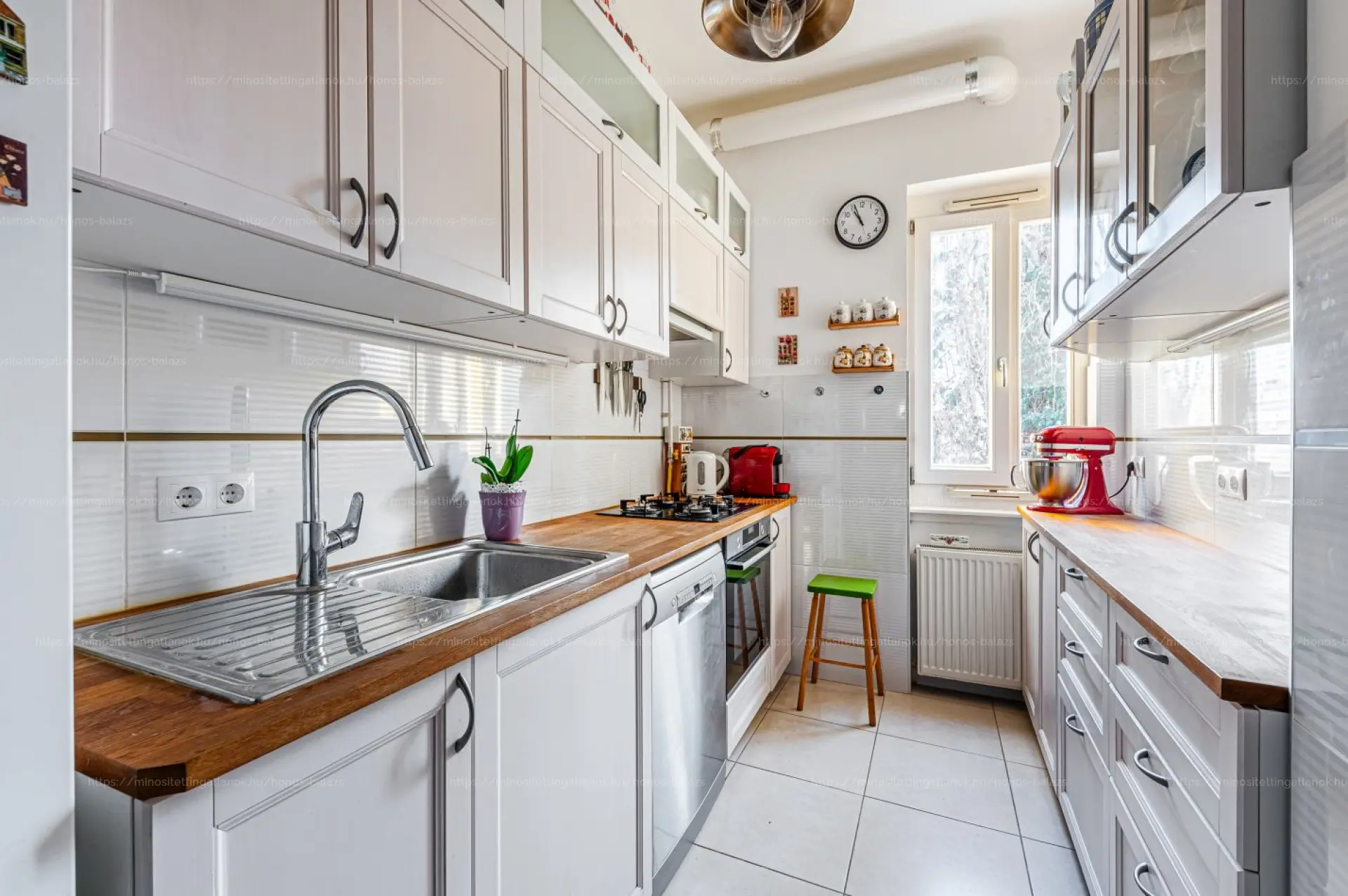 az előszobából balra nyílik a belső kertre néző, keleti tájolású, teljesen bútorozott és gépesített konyha, fehér frontokkal és tömörfa munkapulttal. A konyhával szemben kapott helyet az étkezőként is kiválóan használható hall. Innen érhető el az erkélykapcsolatos nappali, valamint egy másik nagyméretű szoba, amely egyszerre dolgozó- és hálószobaként is ideálisan használható.
