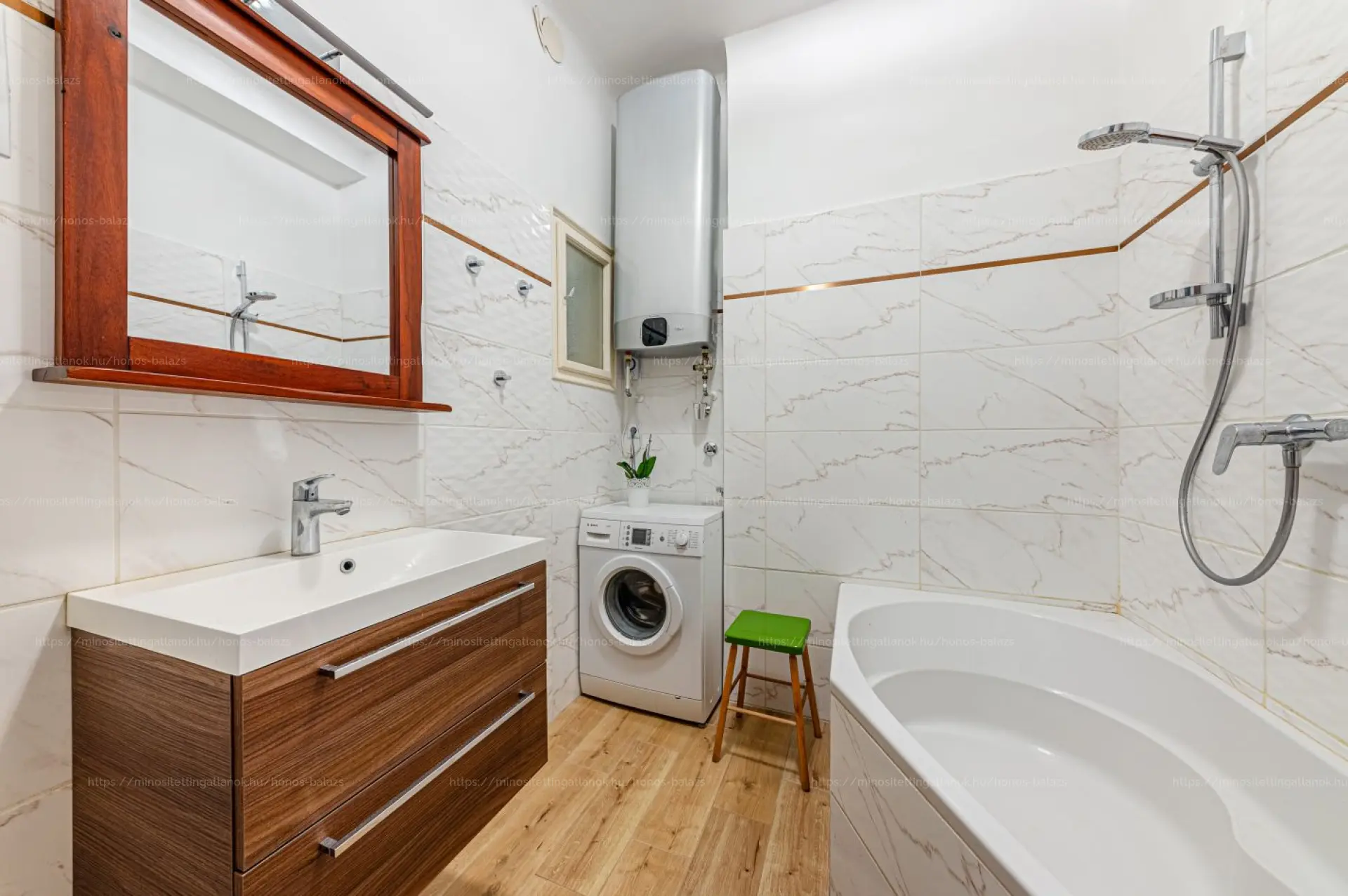 Az ablakos fürdőszobában kényelmes méretű kád, fiókos mosdószekrény és energiatakarékos villanybojler található.