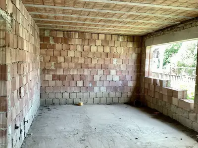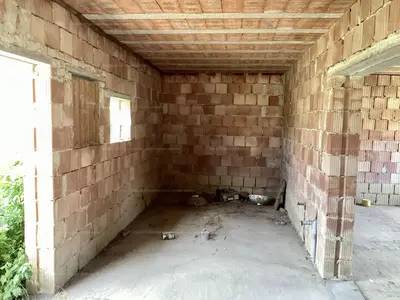 -Szerkezetkész állapotban van: állnak a falak, tető alatt van