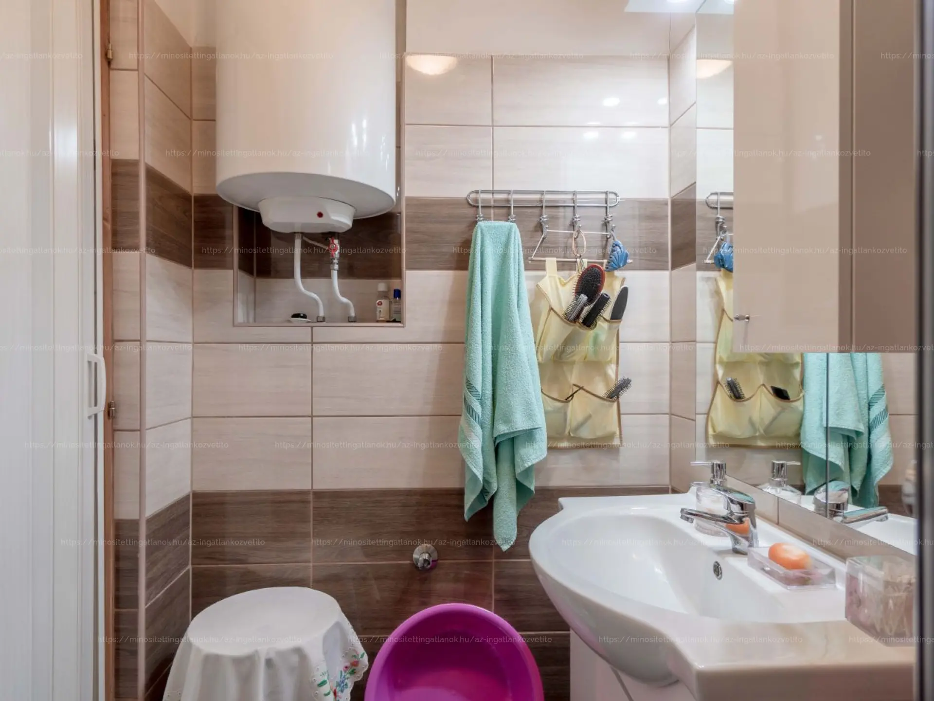 Minden helyiségben gipszkarton álmennyezet található. A padlóburkolat laminált padló a 2 szobában és a közlekedőben, a többi helyiségben kerámia burkolat.