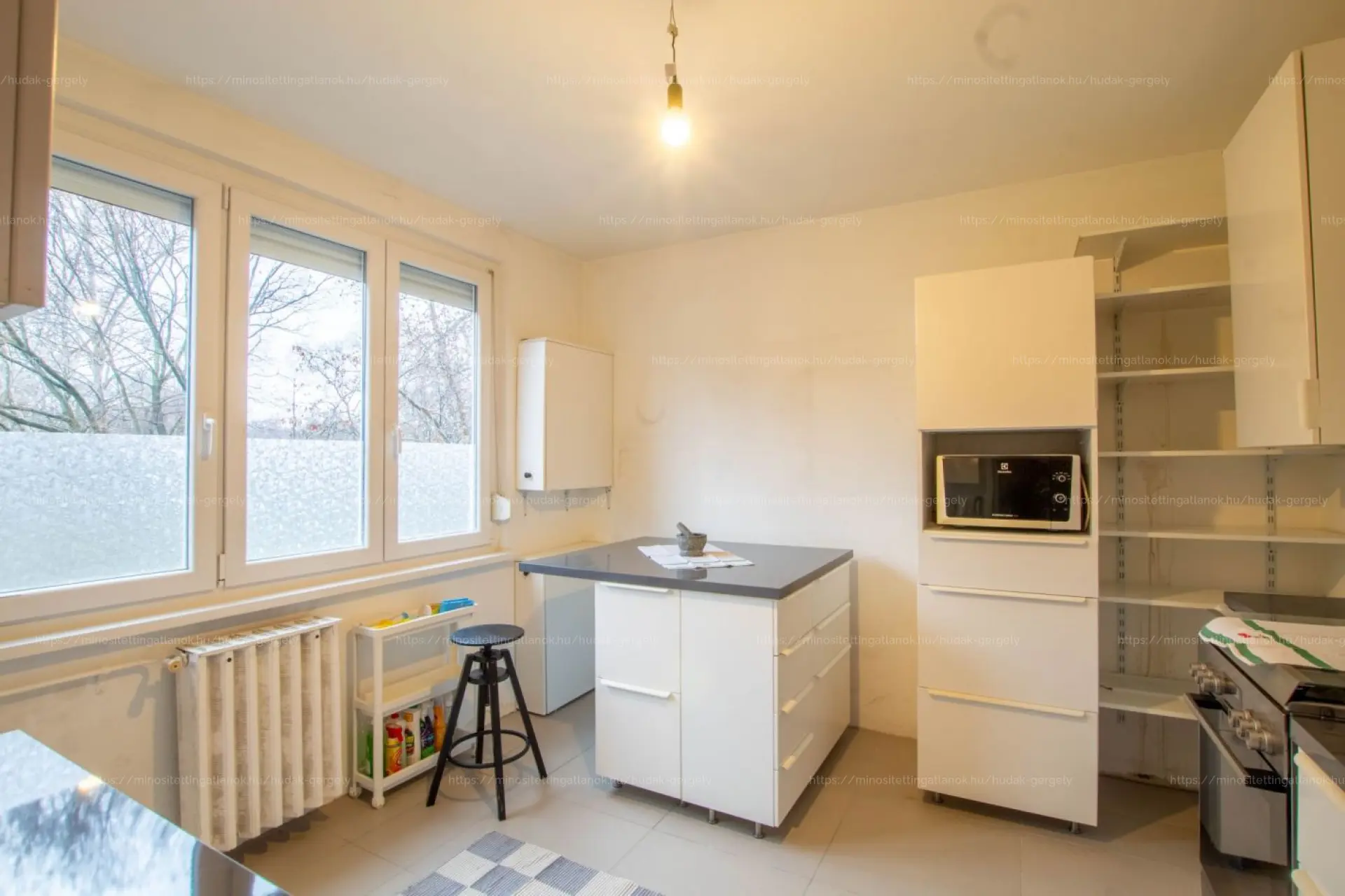 Szélső lakás, így 3 oldalról is ablakos. Kilátás részben parkra, részben utcára.
