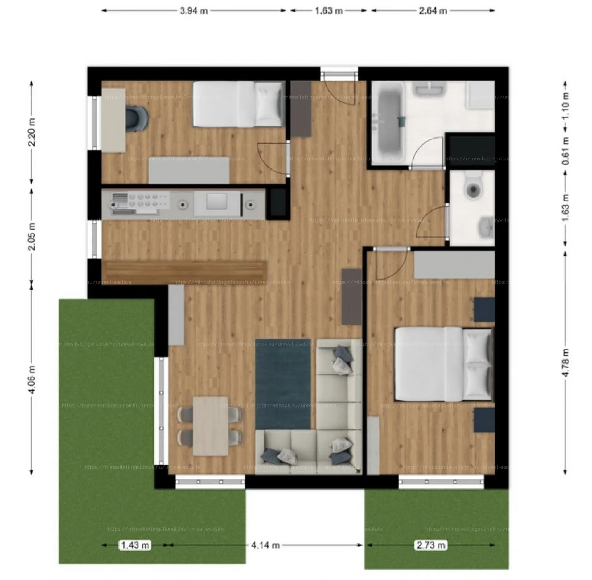Amerikai konyhás nappali + 2 külön nyíló hálószoba + fürdőszoba + külön WC a teljes komfortért.