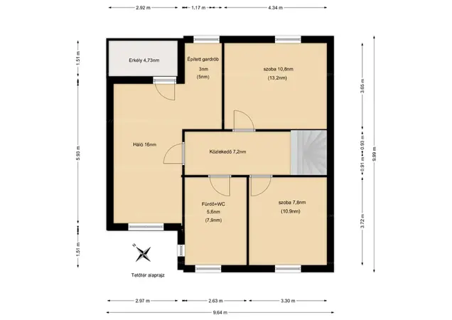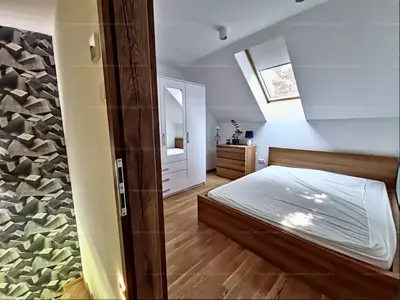 - Beépített tetőtér (50 nm + 4,5 nm ERKÉLY): három hálószoba (8,7 nm; 10,8 nm; 16 nm erkélykapcsolattal) + gardróbszoba beépített szekrényekkel; emeleti fürdő hidromasszázskáddal és WC-vel.