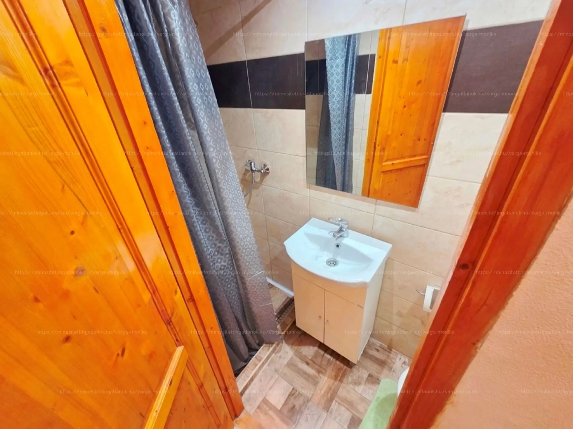 A szoba parkettával, a vizes helyiségek kerámia járólappal burkoltak.