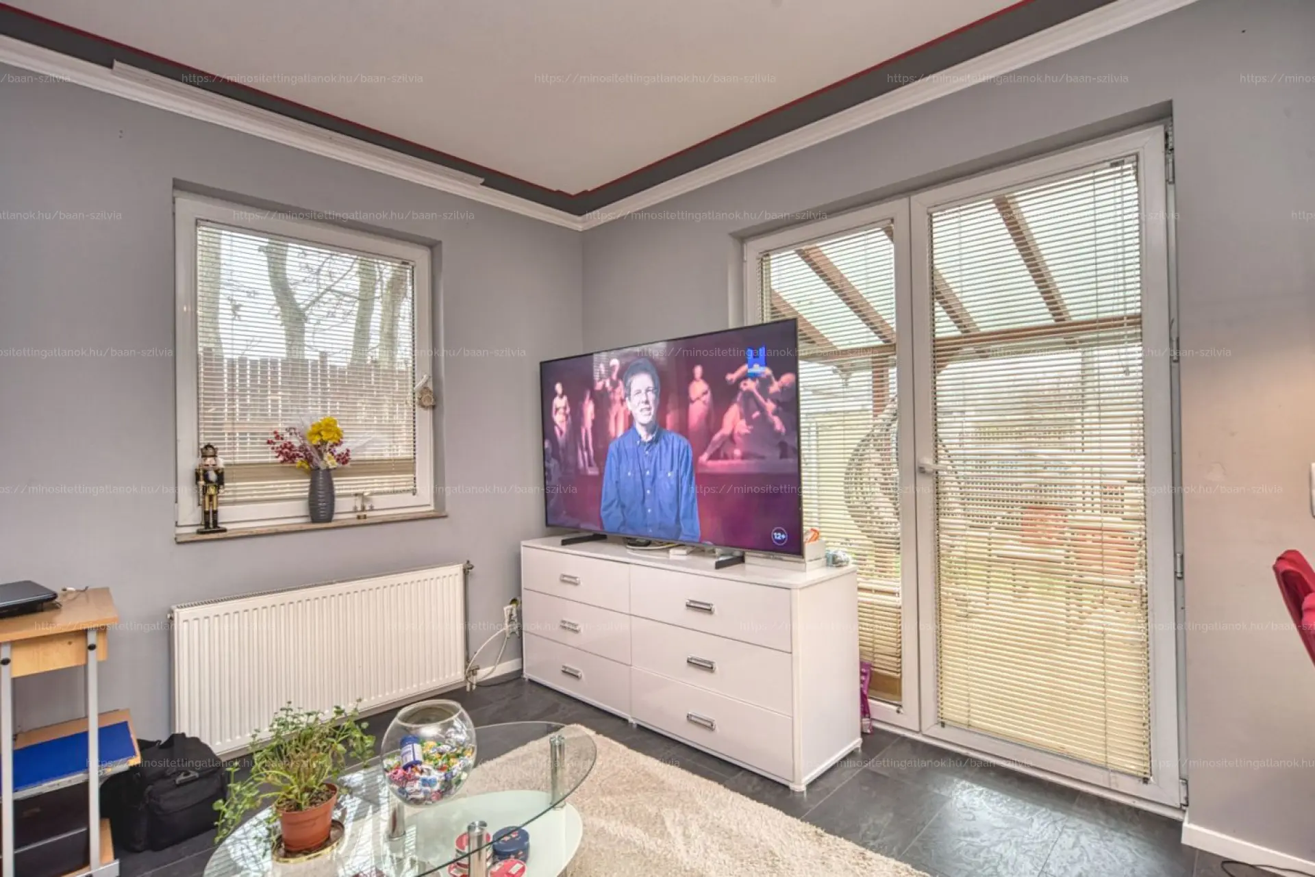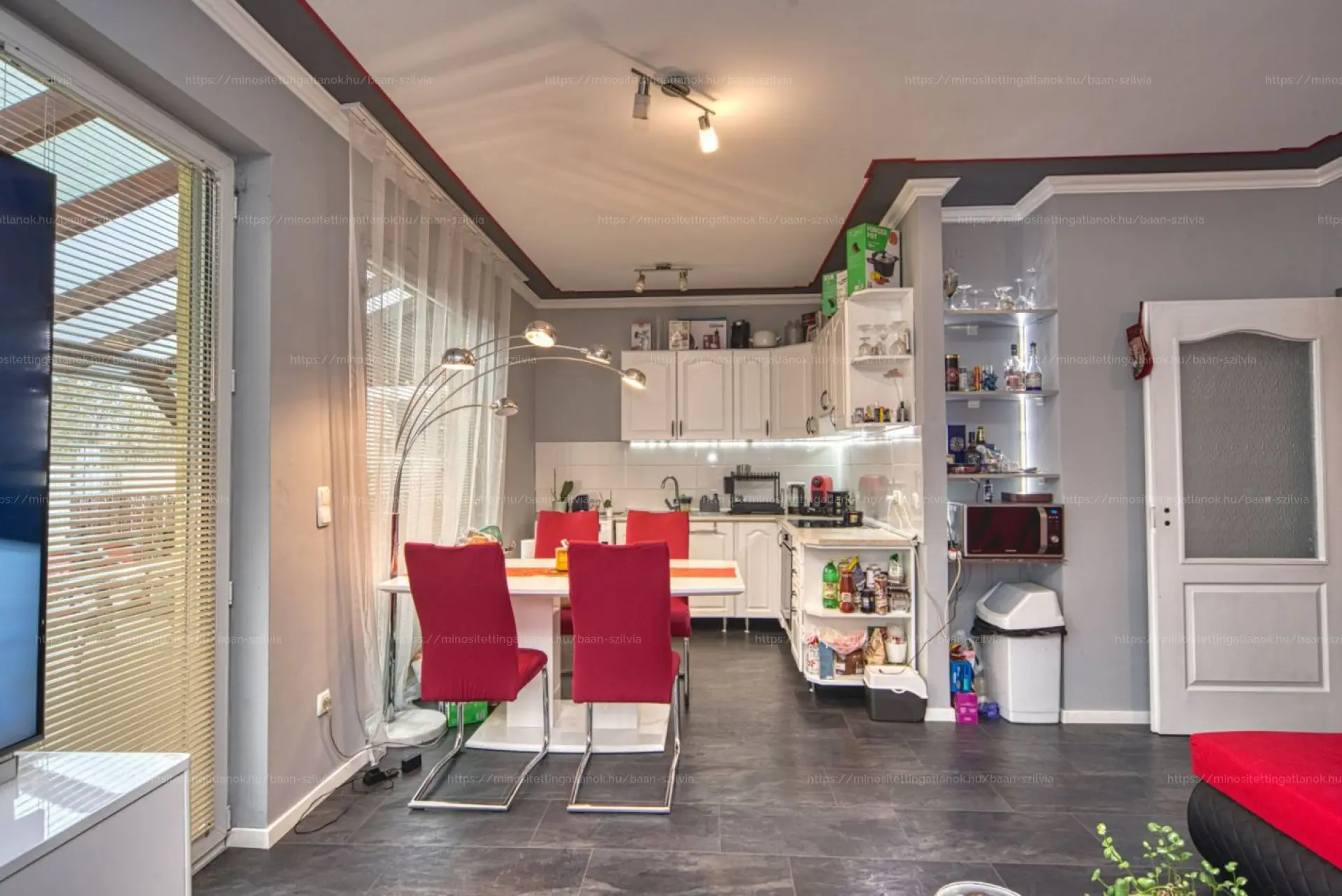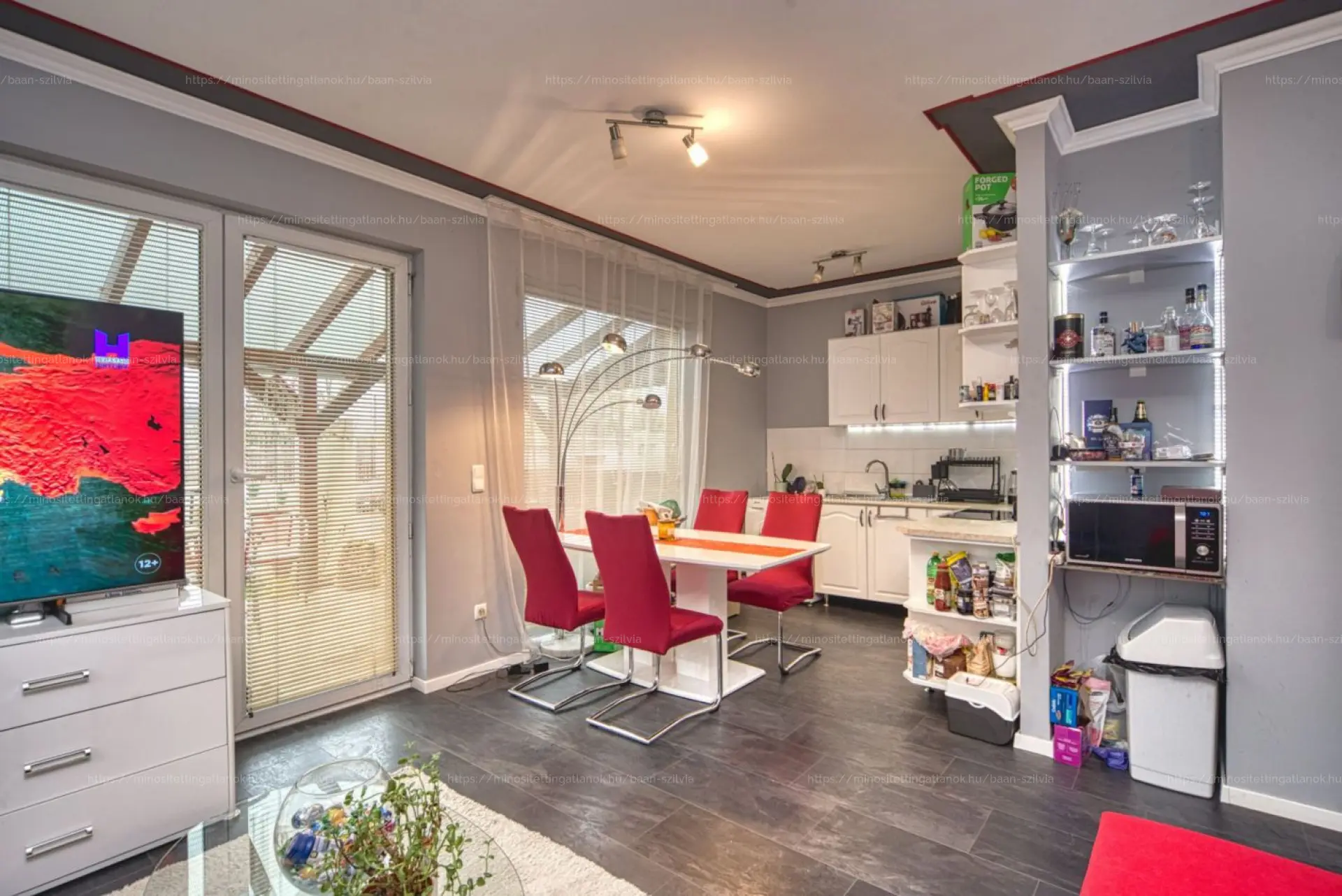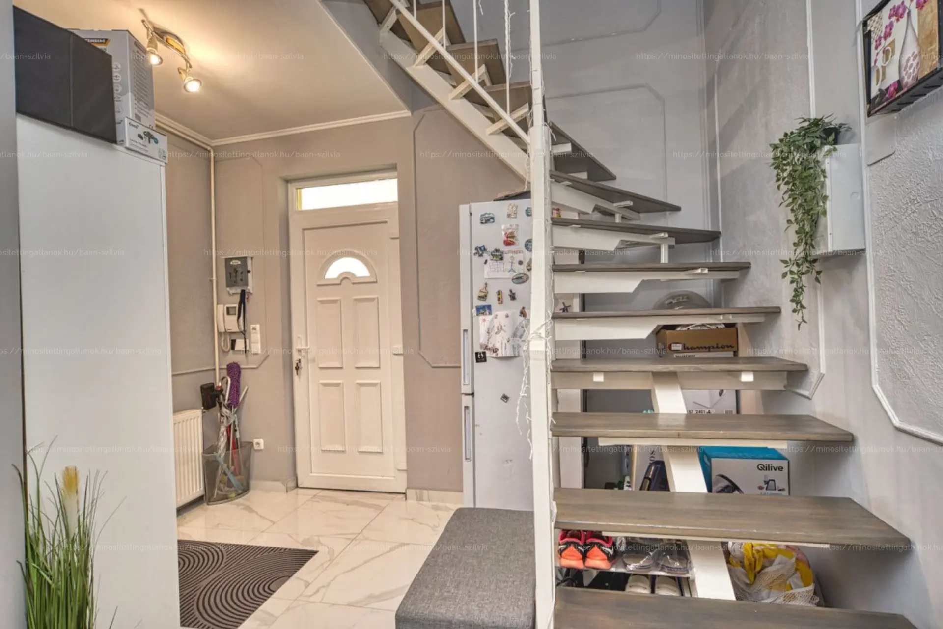 A bejáratnál a napfényben üldögélve lehet élvezni a terasz adta nyugalmat. A házba lépve a földszinten egy korszerűen felszerelt konyha+étkező, nappali, előszoba, szoba és zuhanyzós fürdőszoba található. A fürdőszoba éke a beépített finn szauna, mely eladáskor marad az új tulajdonosnak.