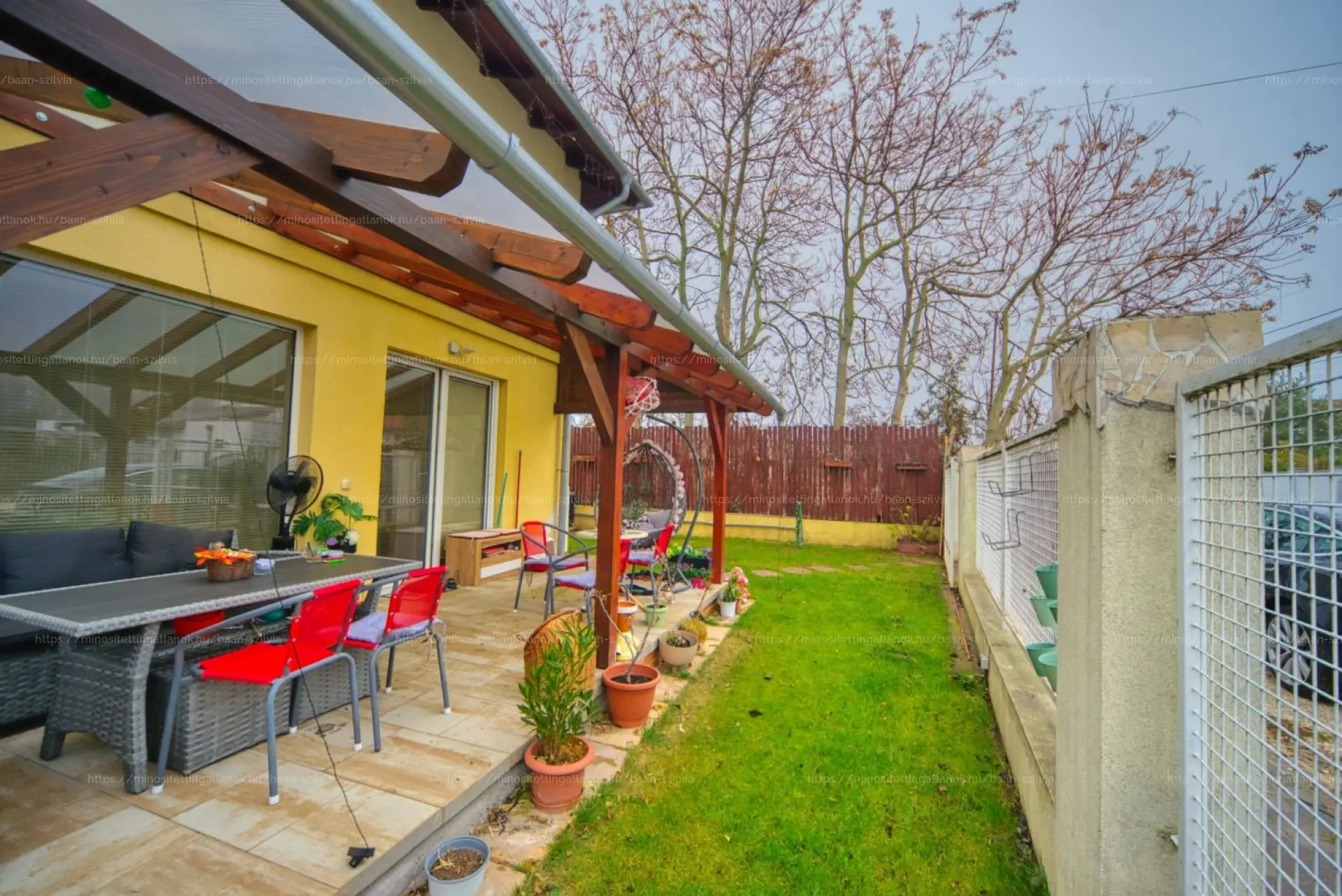 Kapun belépve saját használatú kertbe jutunk, melynek nagysága 180nm, itt helyett kapott egy kis kerti tároló, sütőgető kiülő terasszal, mely családi és baráti események helyszíne lehet. Itt lehetőség van még egy autóbeálló kialakítására is, bár a ház előtti terület ennek a célnak tökéletesen megfelel.