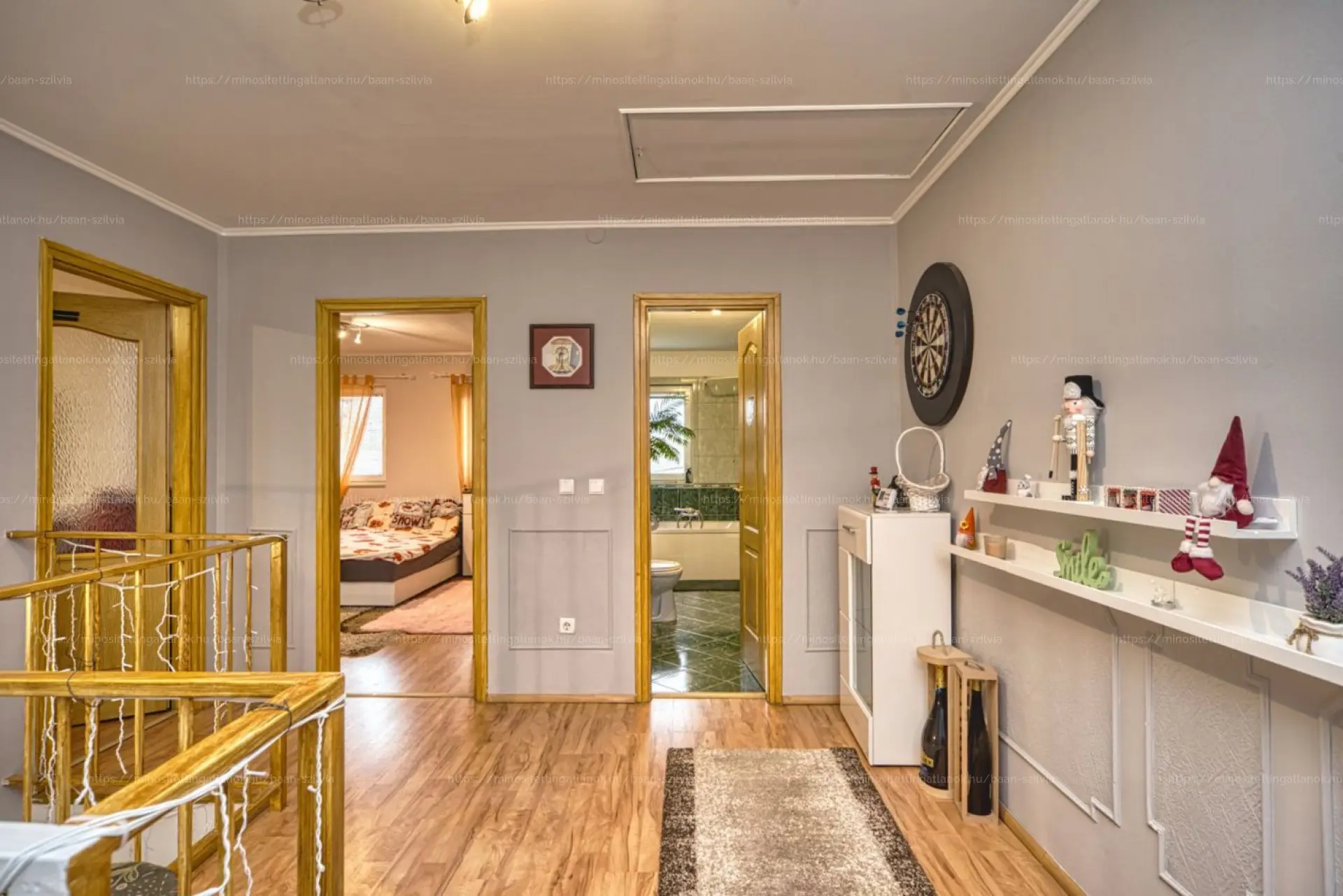Az emeletre stabil fémvázas lépcső vezet, ahol egy pihenő került kialakításra innen nyílik 2 szoba, kádas fürdőszoba.