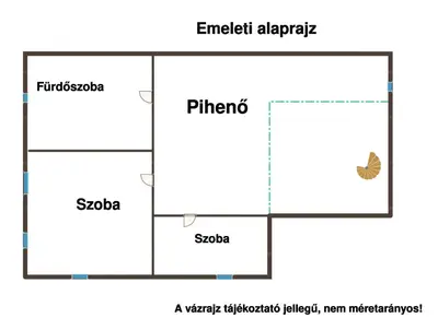 Az emeletre stabil fémvázas lépcső vezet, ahol egy pihenő került kialakításra innen nyílik 2 szoba, kádas fürdőszoba.