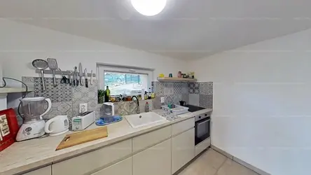 A D-i tájolású, 3 szintes, 106 m2-es, 3 szobás, tégla építésű ikerház félhez 1088 m2-es, enyhén lejtős, körbekerített telek tartozik. Gyümölcsfával, fügefákkal, örökzöld bokrokkal részben beültetett kertje tovább növeli a hely intimitását, valamint a nagysága lehetőséget teremt akár tiny house vagy jurta elhelyezésére.