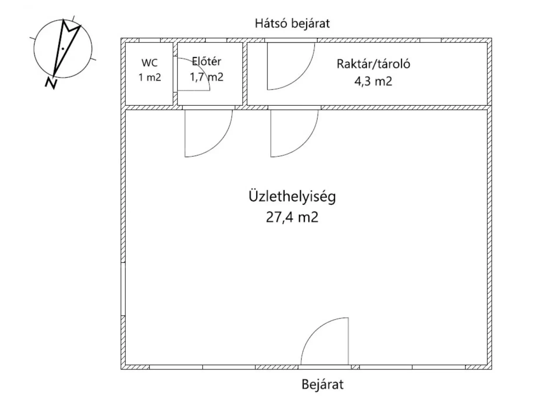 -Méretek: Üzletrész 27,4m2; Raktár/tároló 4,3m2; vizesblokk + wc 2,7m2