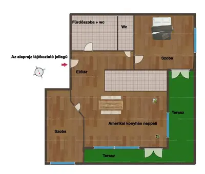 A nagy méretű ablakoknak köszönhetően a lakás egész nap világos, napfényes. A terasz a parkosított, zöld belső udvarra néz, így teljes nyugalmat biztosít.
