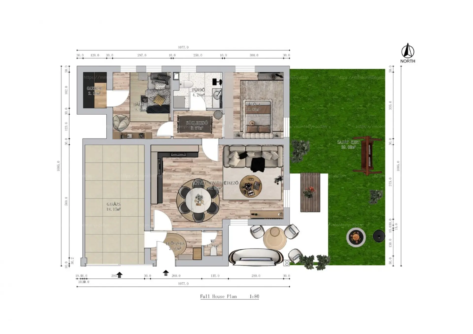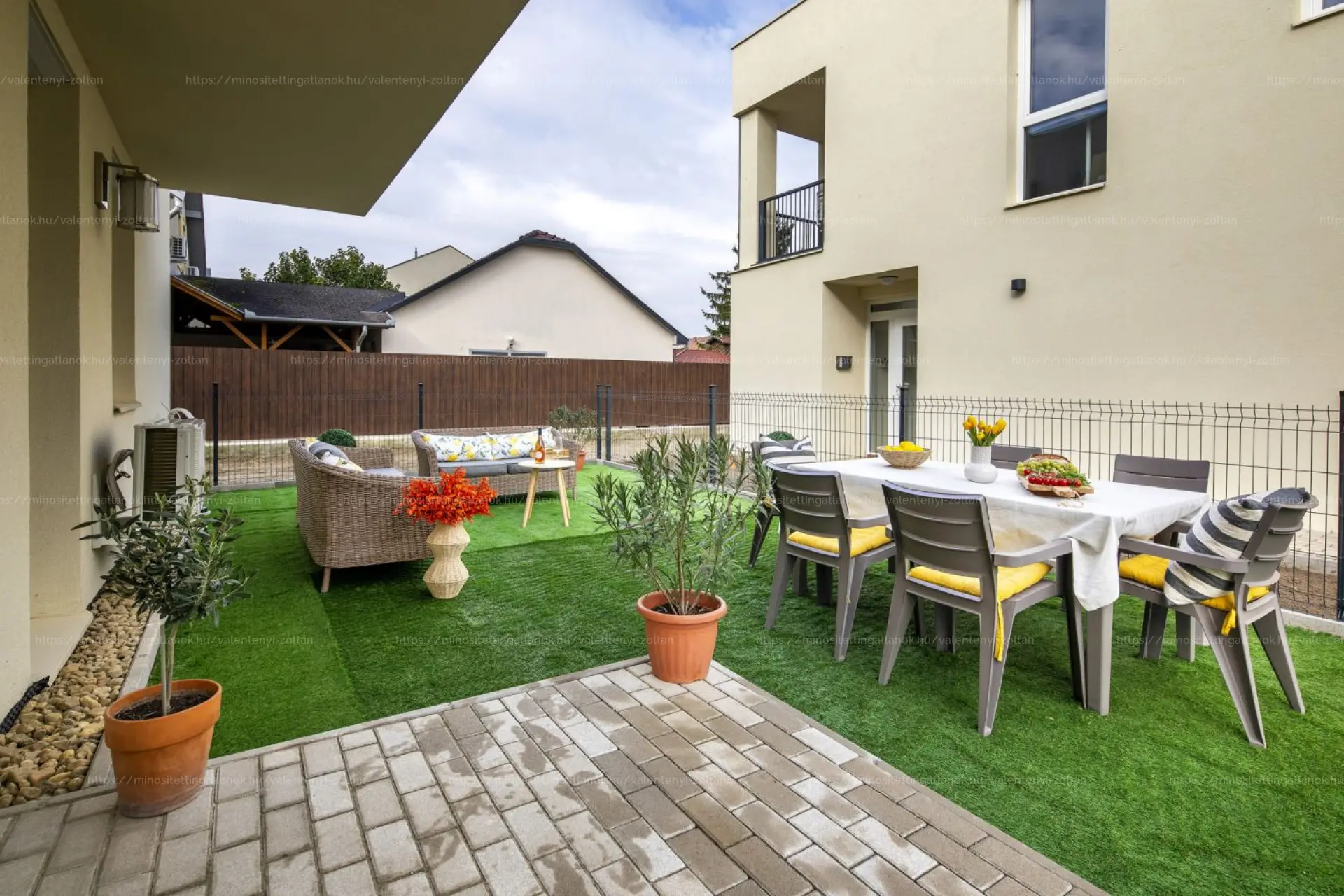 A 45 m²-es elkerített saját kert és a 15,5 m²-es részben fedett terasz valóságos menedék: legyen szó reggeli kávéról, gyerekek játékáról vagy kisállatról, itt minden adott a kényelmes, gondozásmentes élethez.