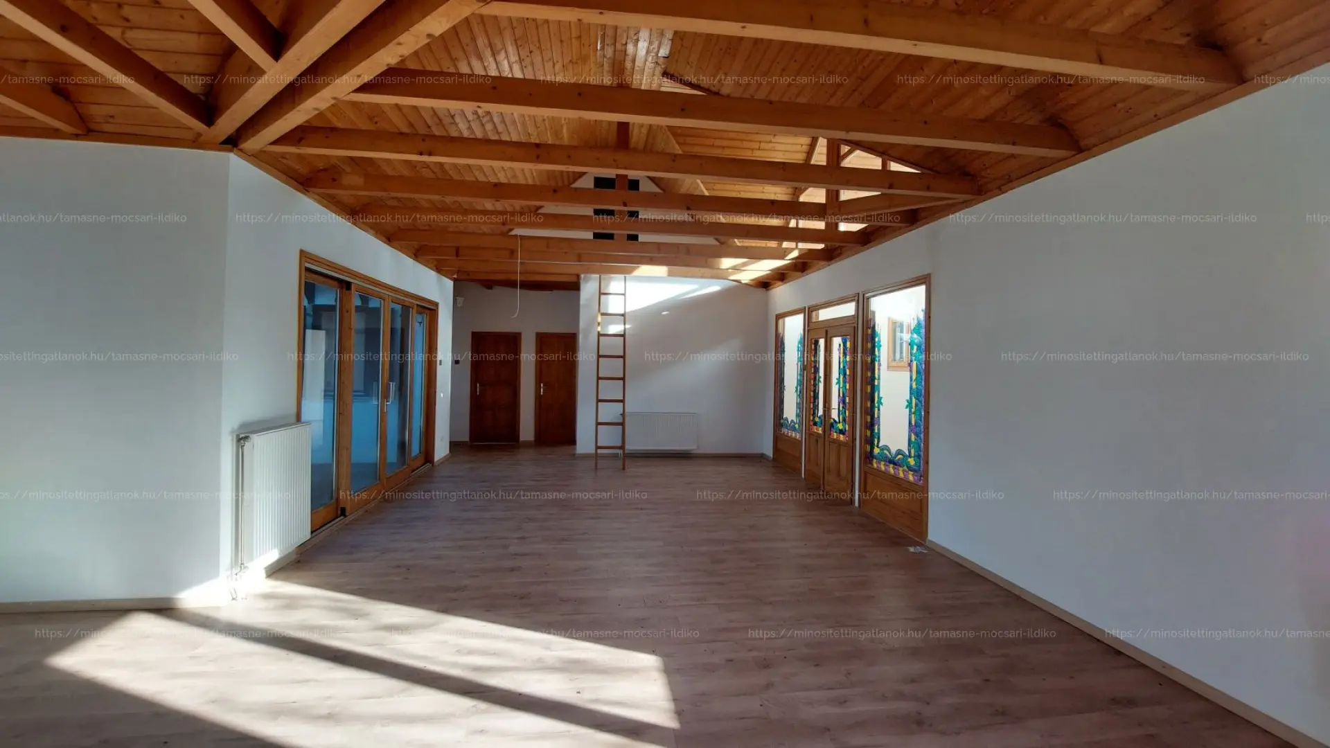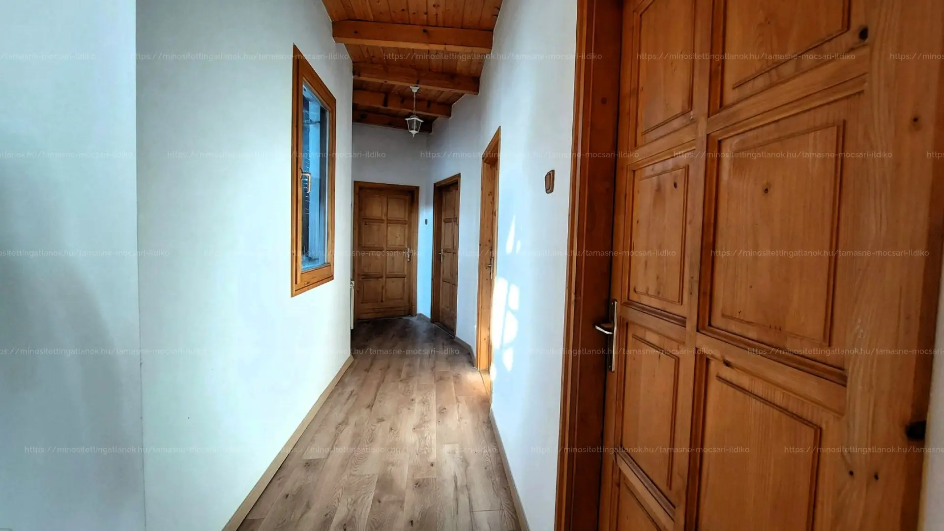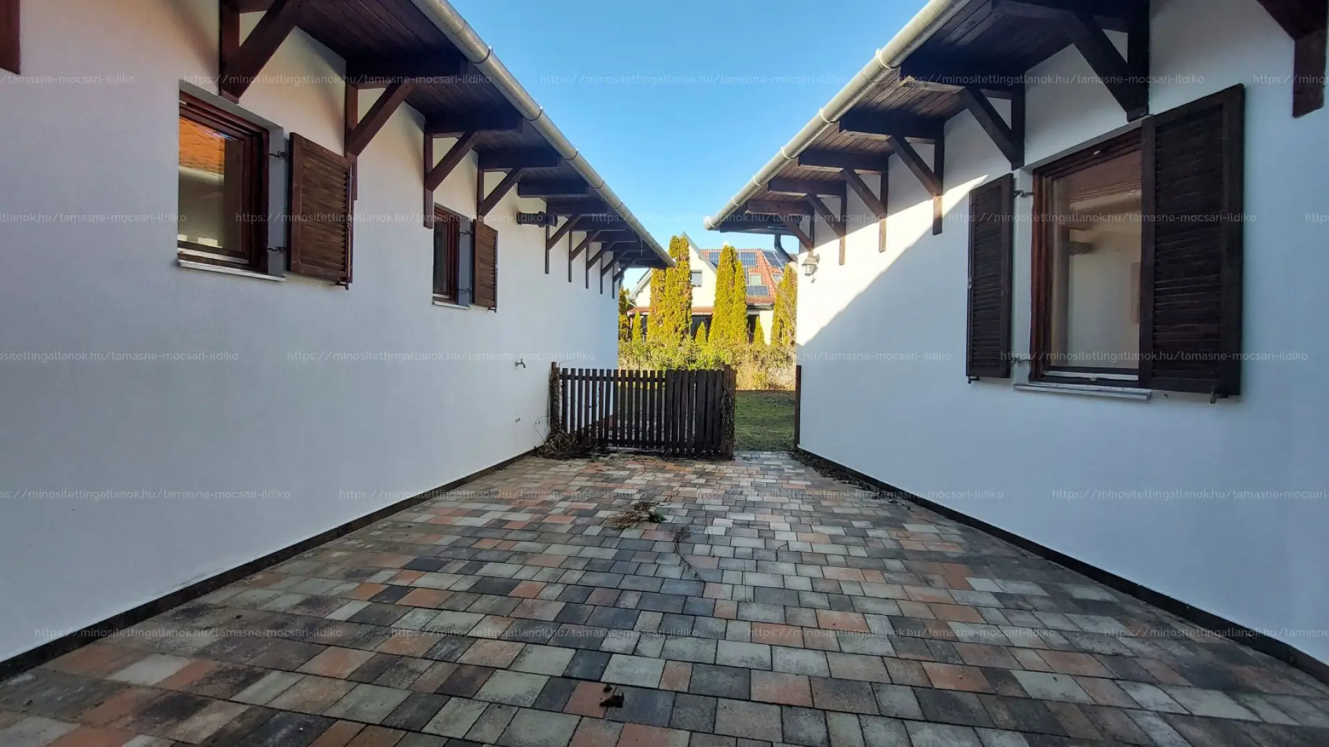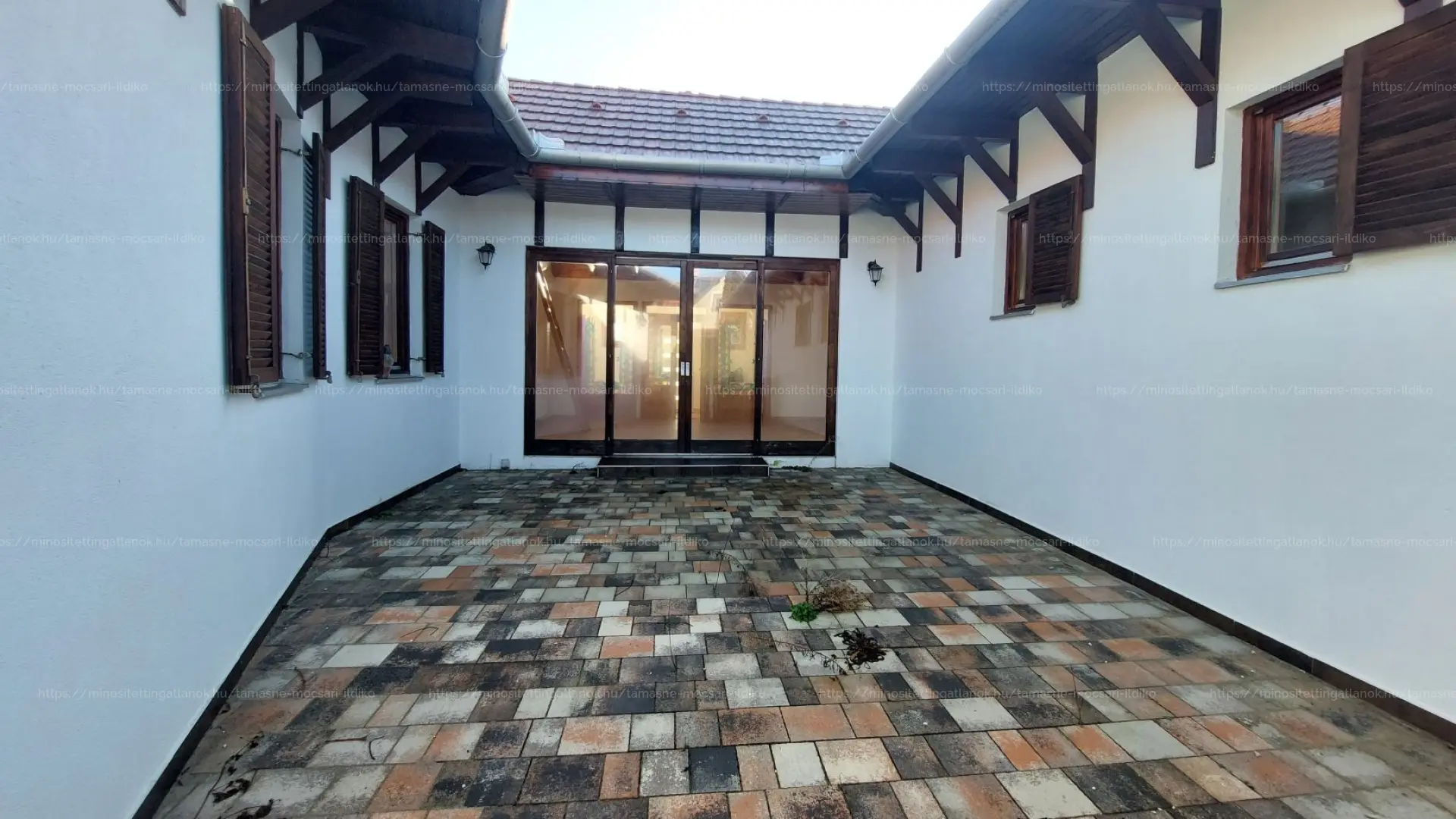 Az ingatlan U alakú kialakítású, a két épületszárny egy meghitt, kíváncsi tekintetektől védett teraszt vesz körül. Körbenapozott, jól megtervezett, a belső tér hangulatát mutatós fa gerendák emelik ki.