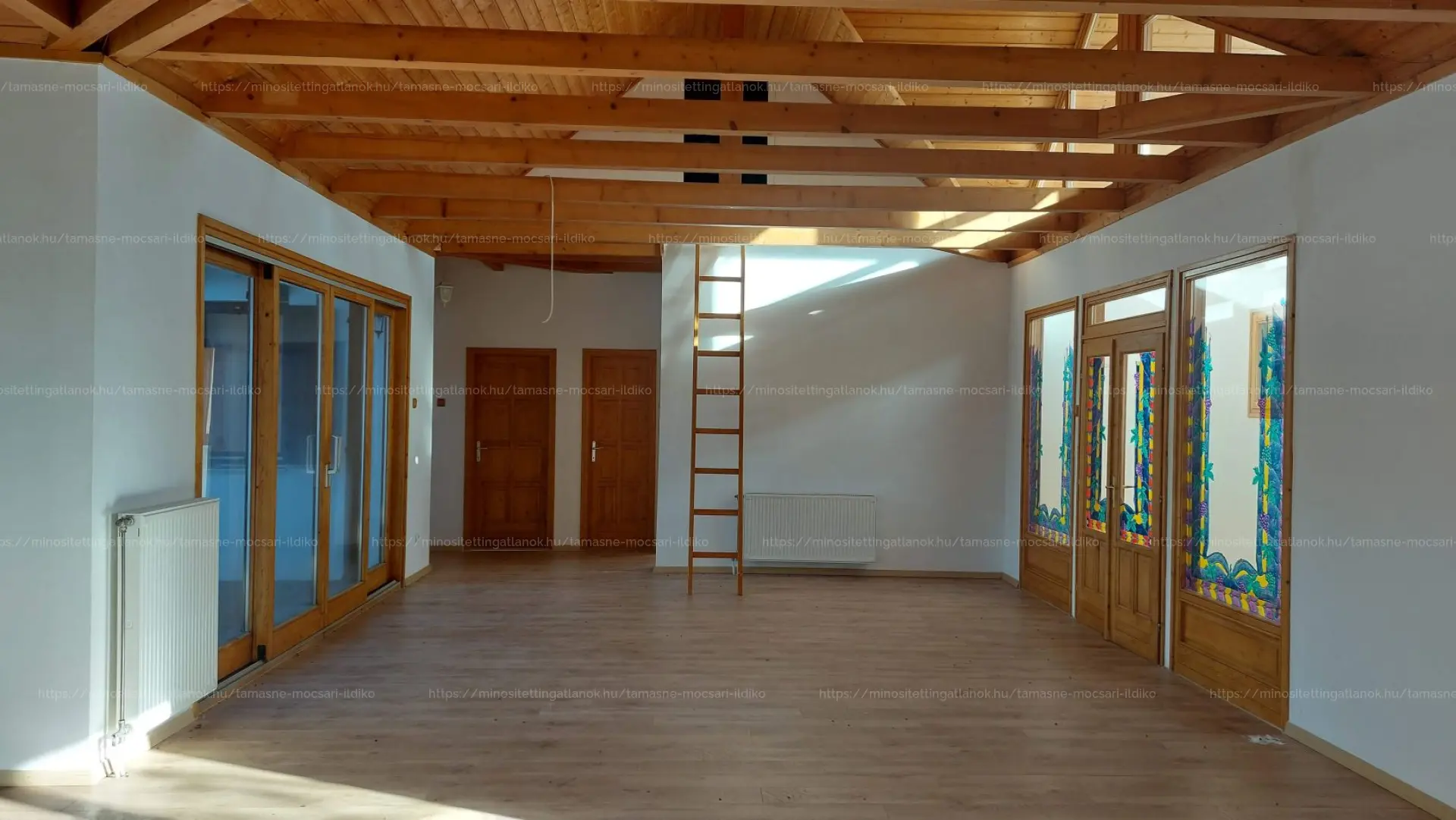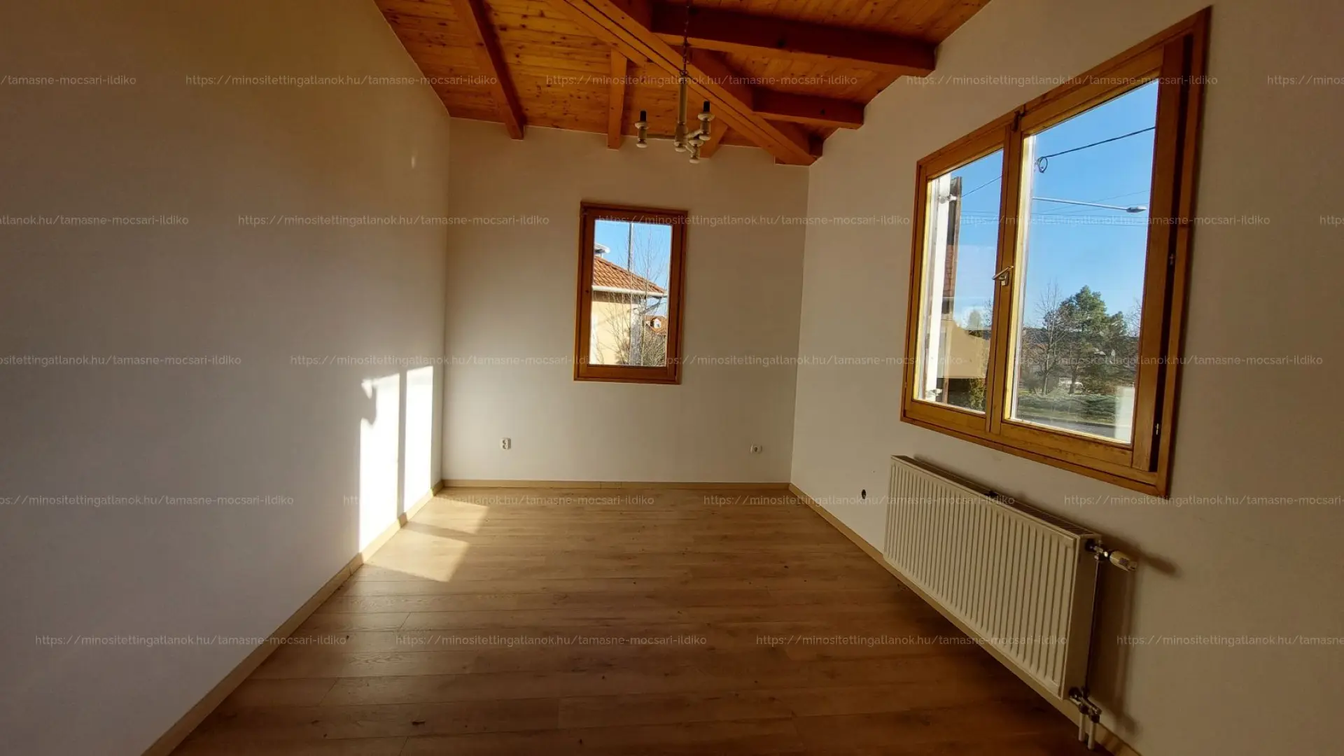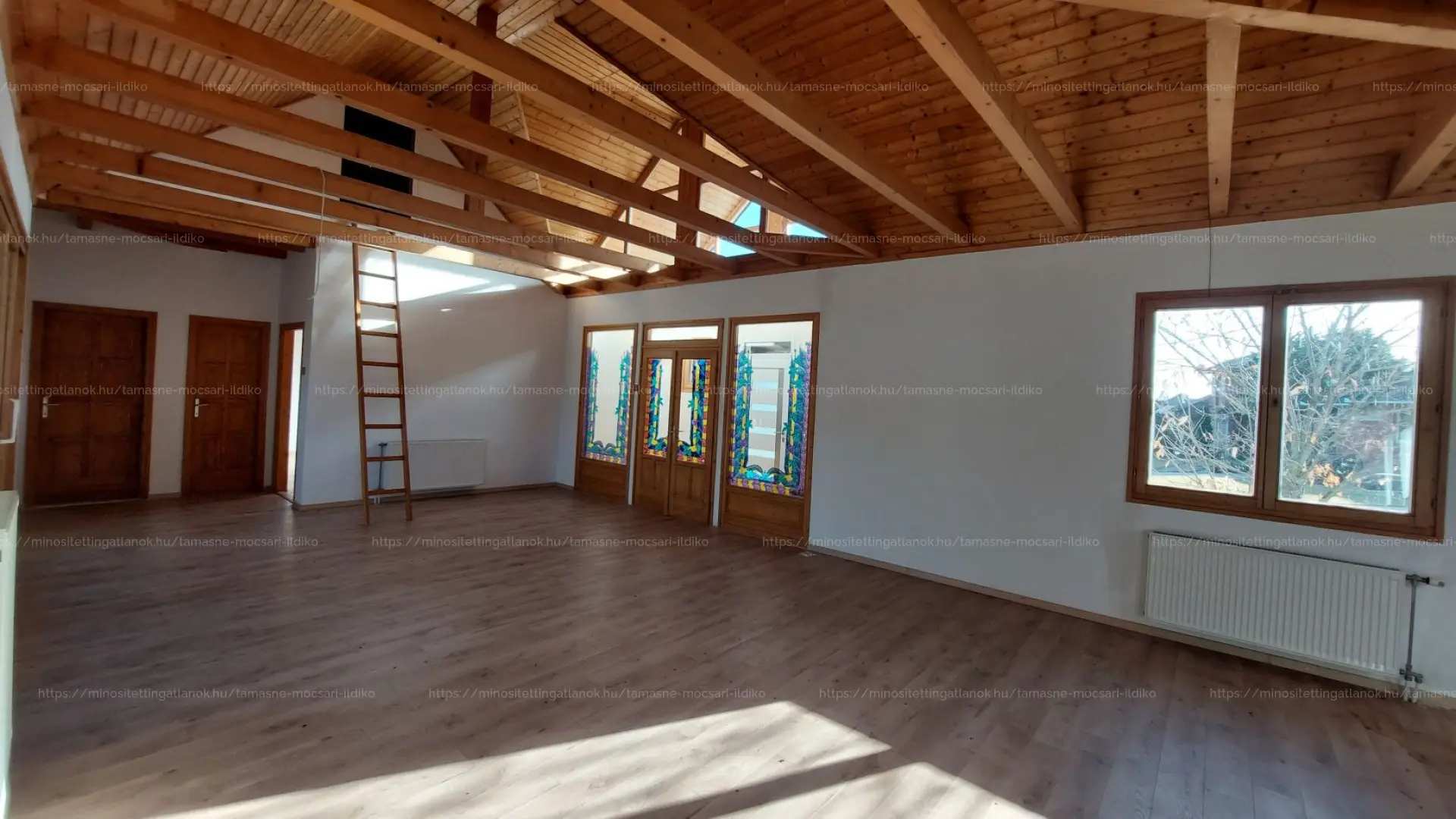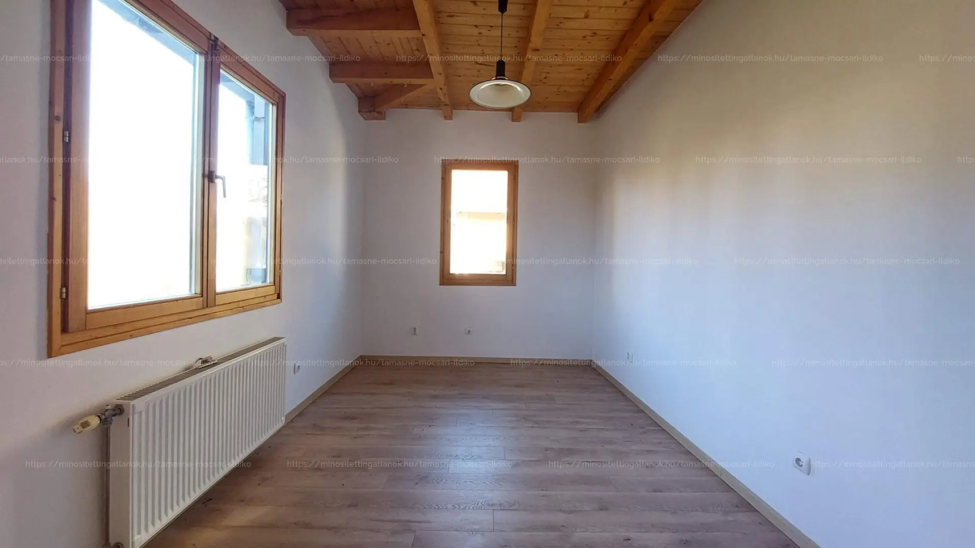 Az ingatlan U alakú kialakítású, a két épületszárny egy meghitt, kíváncsi tekintetektől védett teraszt vesz körül. Körbenapozott, jól megtervezett, a belső tér hangulatát mutatós fa gerendák emelik ki.