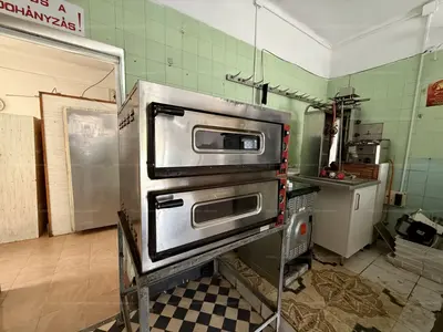 Az üzlethez professzionális PIZZASÜTŐ KEMENCE is tartozik, amely 15 pizza egyidejű elkészítésére KÉPES, maximum 500 °C üzemelési hőmérséklettel. A NAGYKONYHAI GÉPEK (dagasztó, elektromos pizzasütő, girosz- és flekkensütő, hűtőpultok) külön is megvásárolhatók.