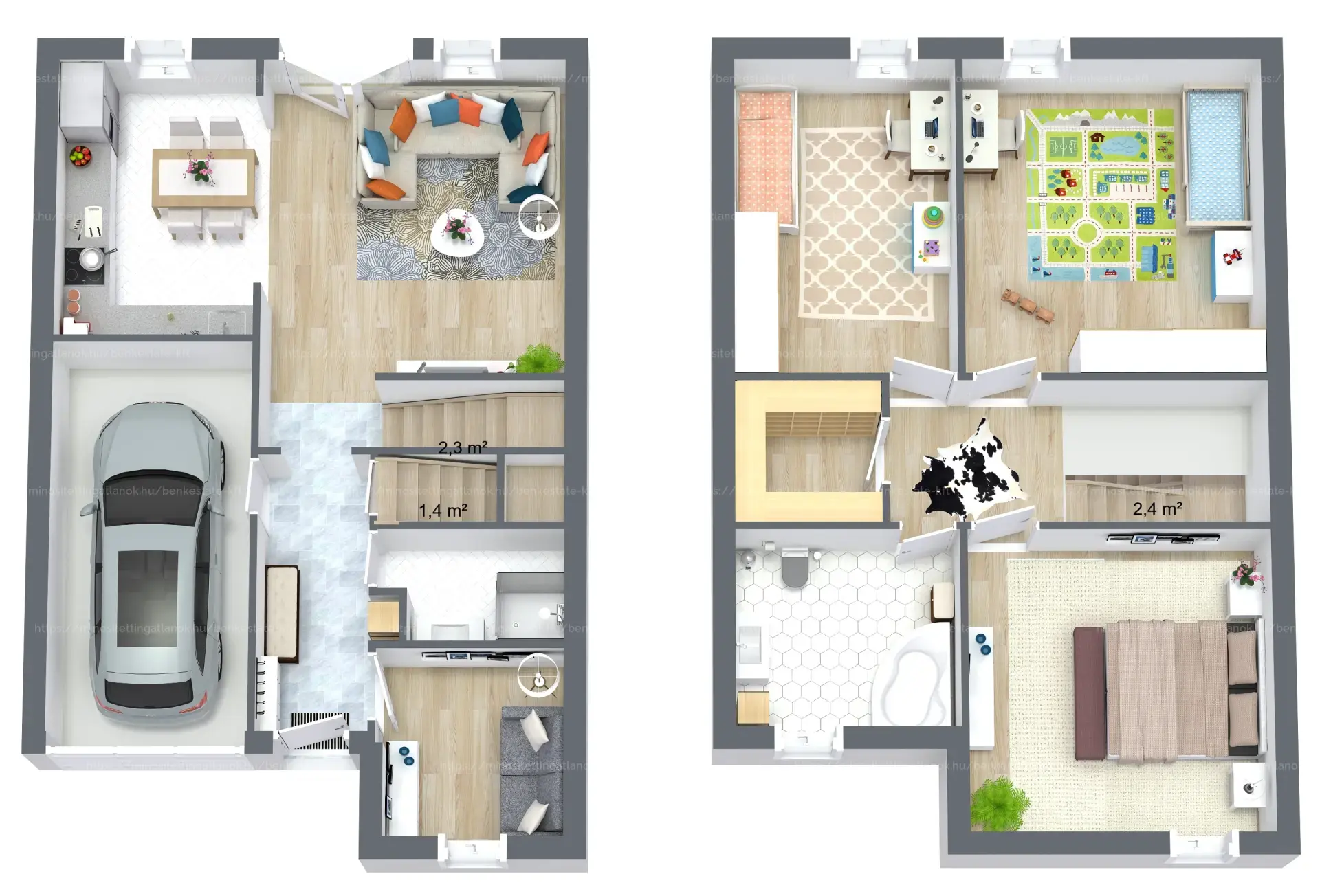 a földszinten az egybenyitott, tágas nappali-étkező konyhában szemmel tarthatjuk az aprónépet, míg készül az ebéd, de találunk itt egy félszobát is (6 nm), ha Apa elvonulna dolgozni, vagy ha a Nagyi jön látogatóba, egy fürdőt, külön wc-t és egy garázst, ahova a családi autóval parkolhatunk, vagy ahol rengeteg holmit el tudunk raktározni.