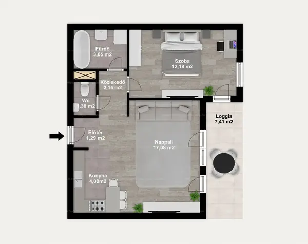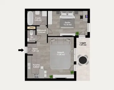 7 m2-es, keleti tájolású teraszon kényelmesen elférhetünk.