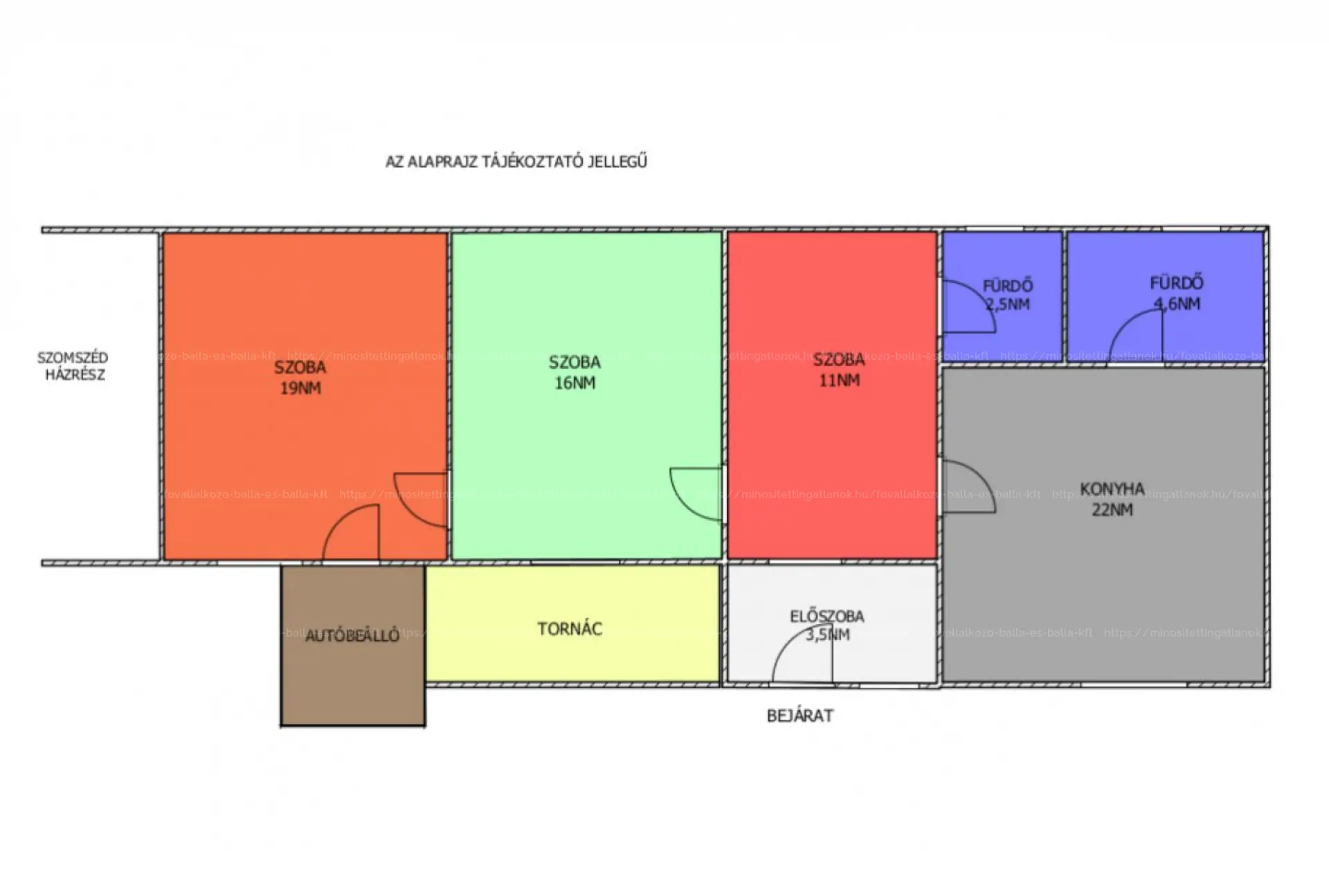 Három tágas, világos szoba (19,16,11) és egy 22 nm-es konyha-étkező biztosít kényelmes életteret. Két fürdőszoba biztosítja a reggeli készülődést.
